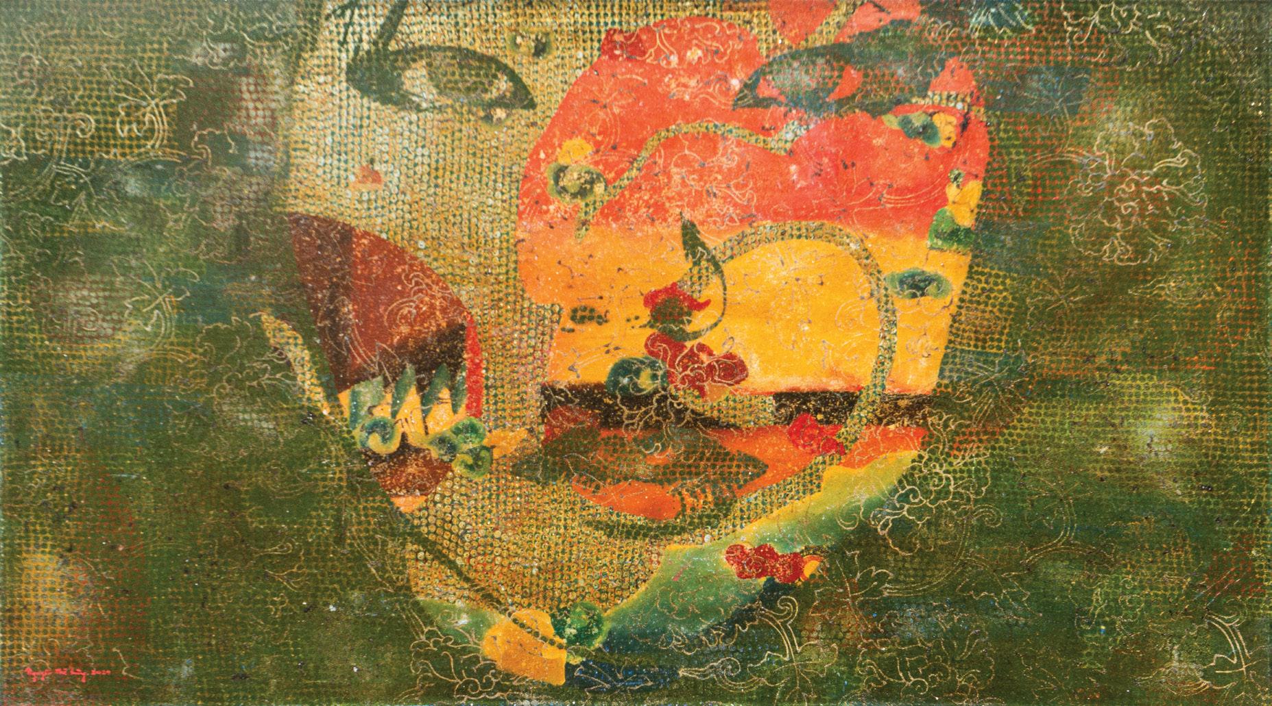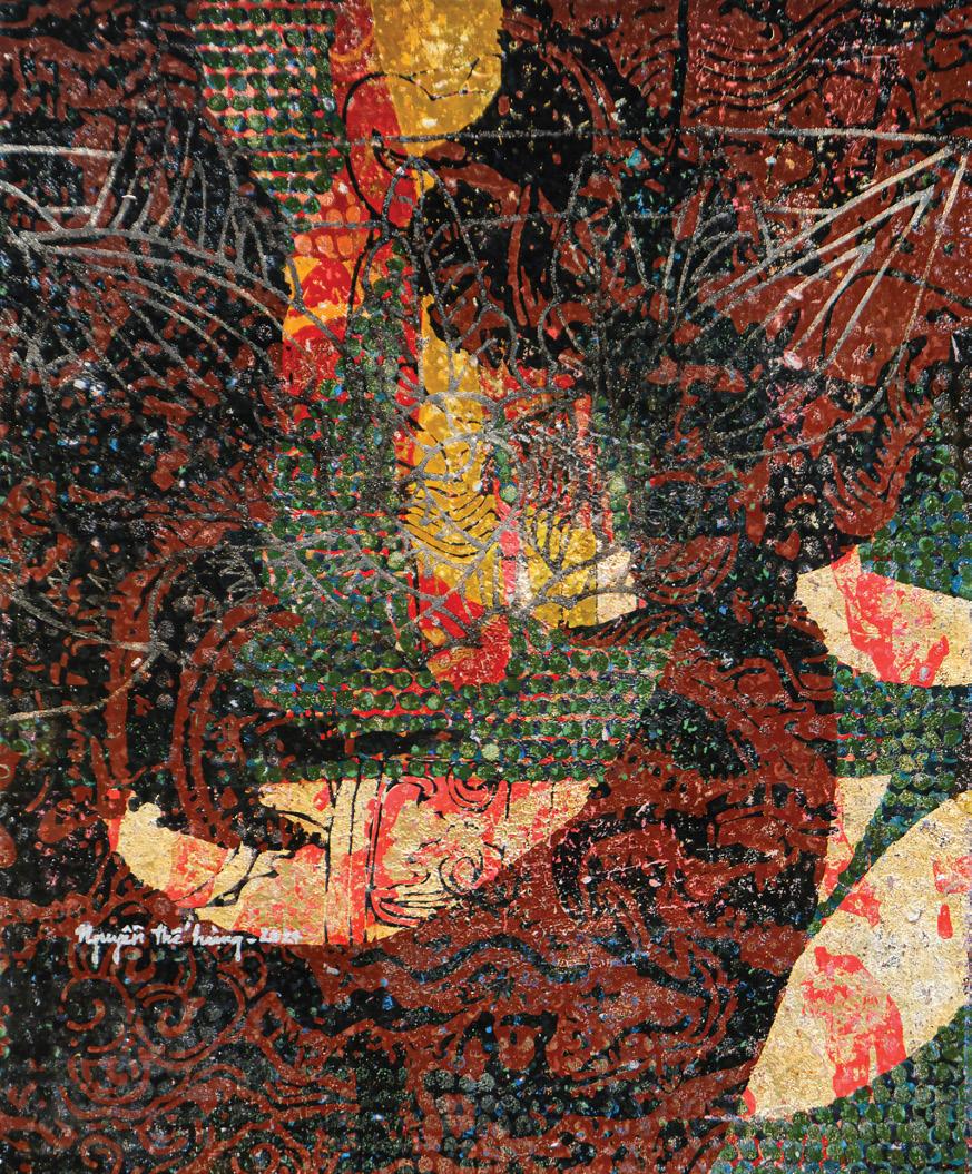 With remarkable mastery of technique, Nguyen The Hung balances the defining characteristics of traditional lacquer painting (bold, radiant, and translucent colors) with a contemporary approach (expressionism, abstraction, and soft blurring). In certain artworks, light seems to emanate from within the painting itself, while in others, it is absorbed into layers of deep, meditative lacquer, evoking a sense of time buried beneath the surface or memories gradually fading away. Traditional Vietnamese cultural motifs such as dragons, lotuses, ancient ceramic carvings,