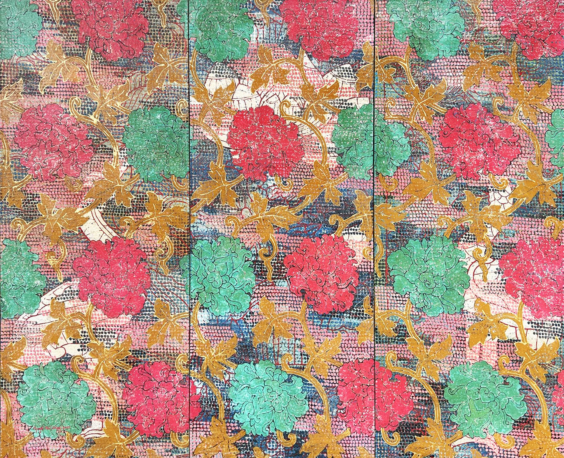 Trong một số bức tranh, chúng ta có thể nhận ra hình ảnh hoa văn truyền thống bị đan xen vào những mảng màu trừu tượng, hoặc những đường nét vẽ tay mềm mại đối lập với những mảng sơn sắc lạnh.