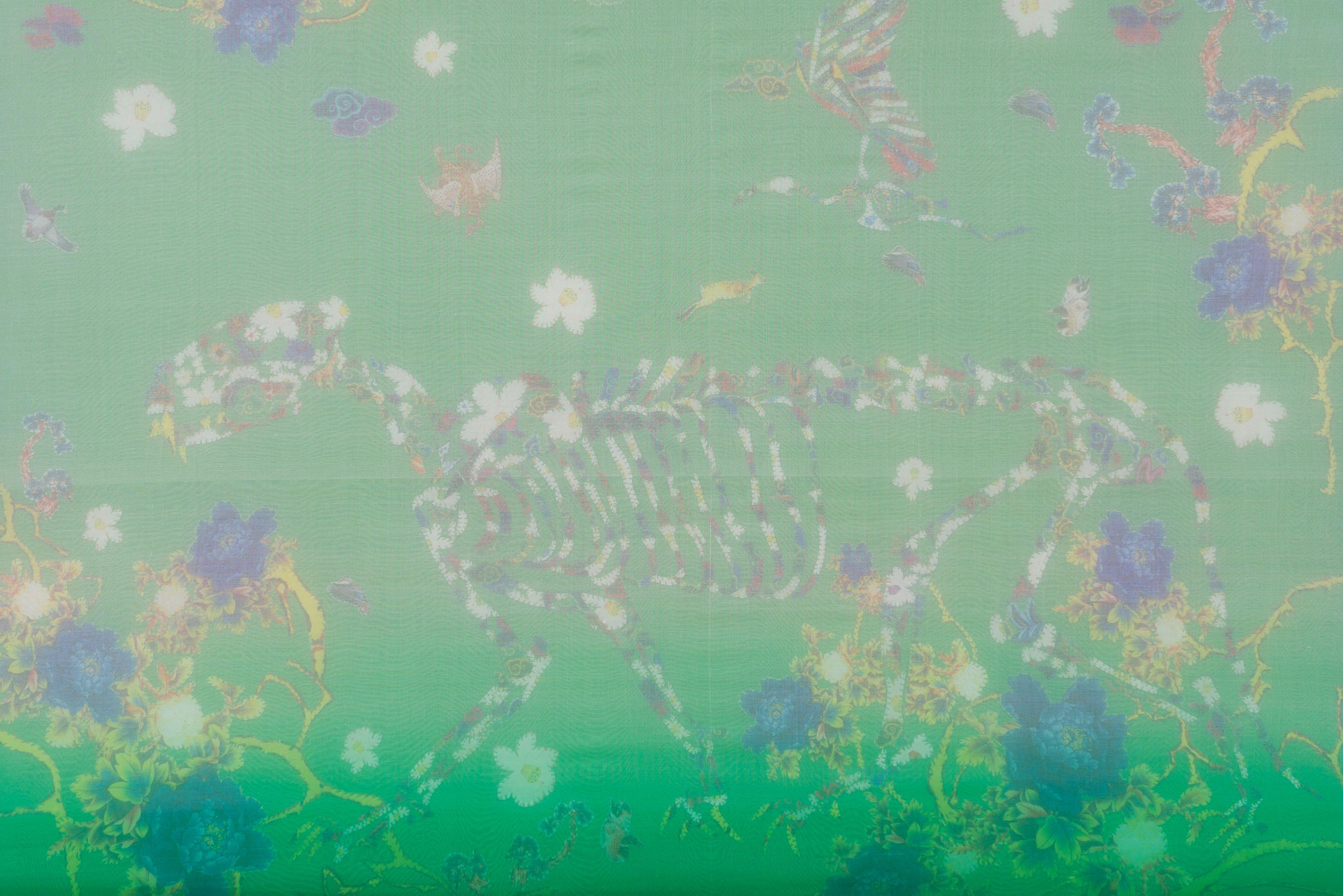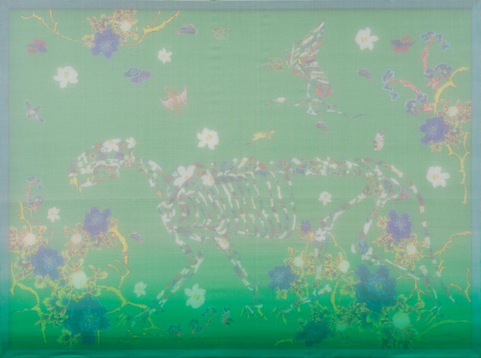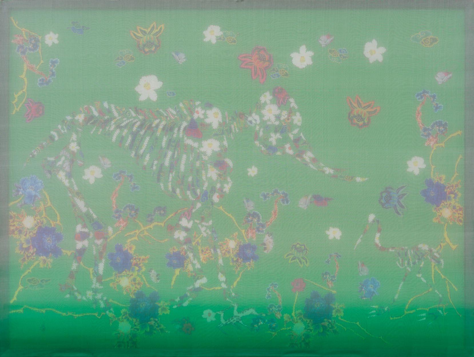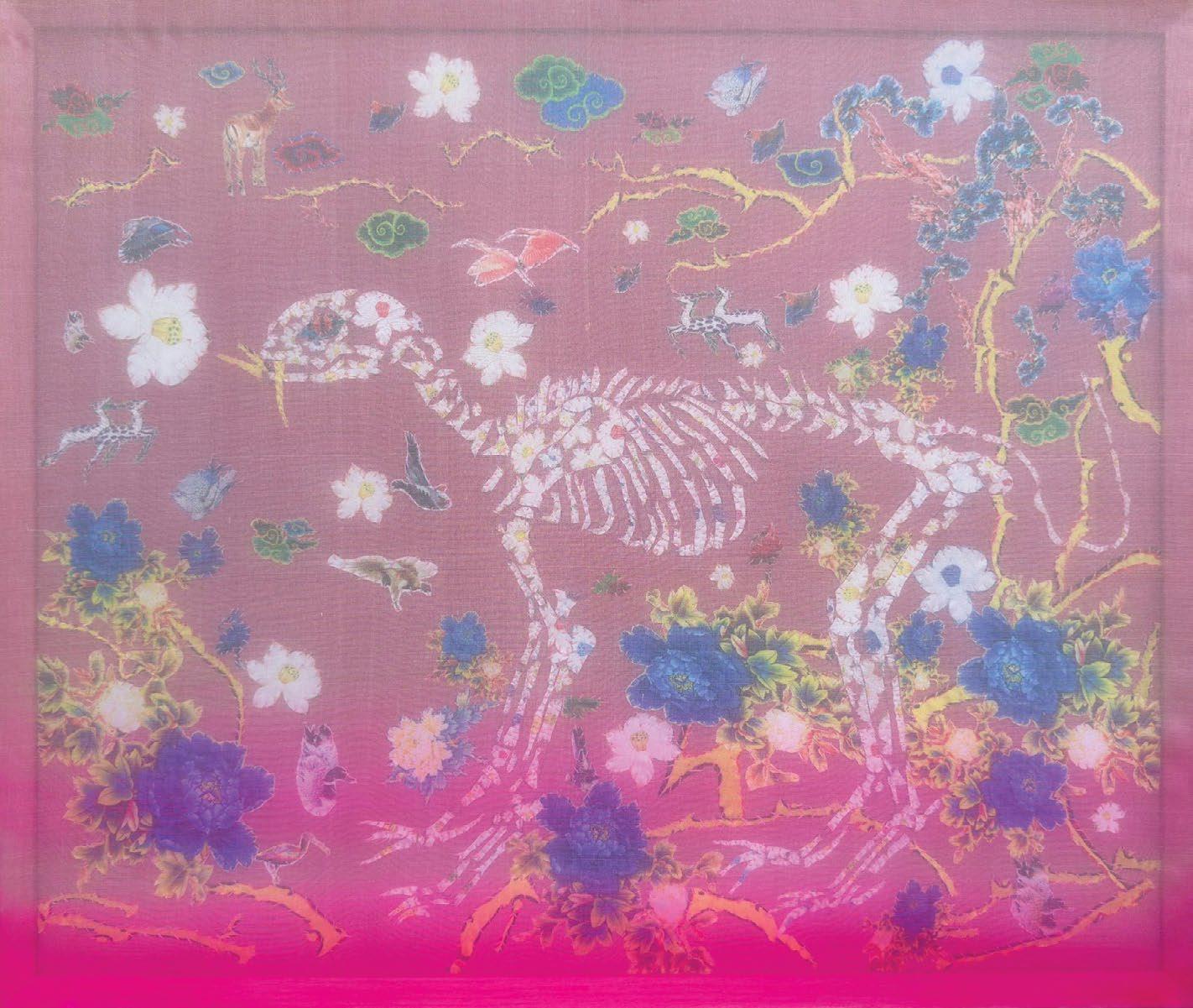 I observe the dissolution and reformation of distinct elements: skin, bones, living creatures, animals, and more. Not to analyze life and death; instead, each of these elements is crafted from floral-patterned fabric, representing their roots in nature.