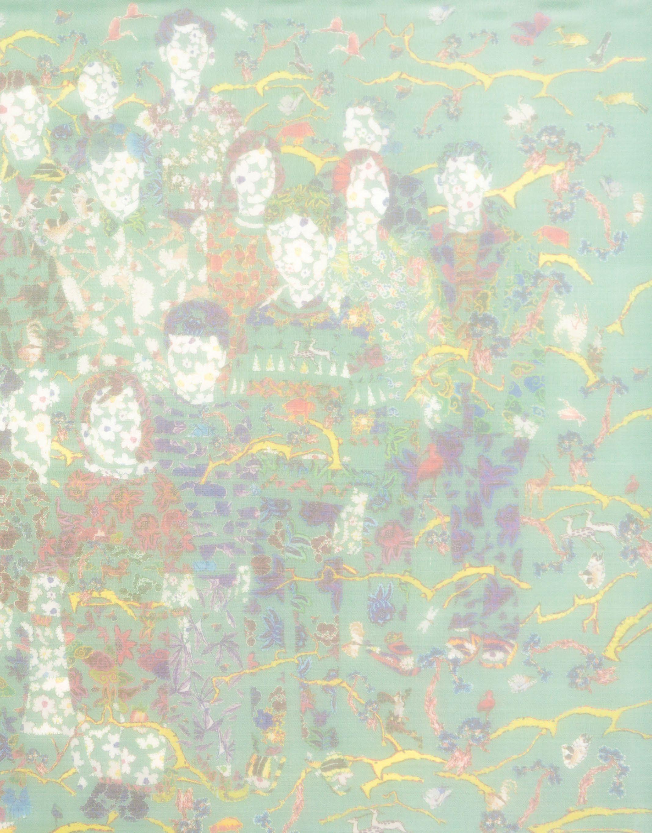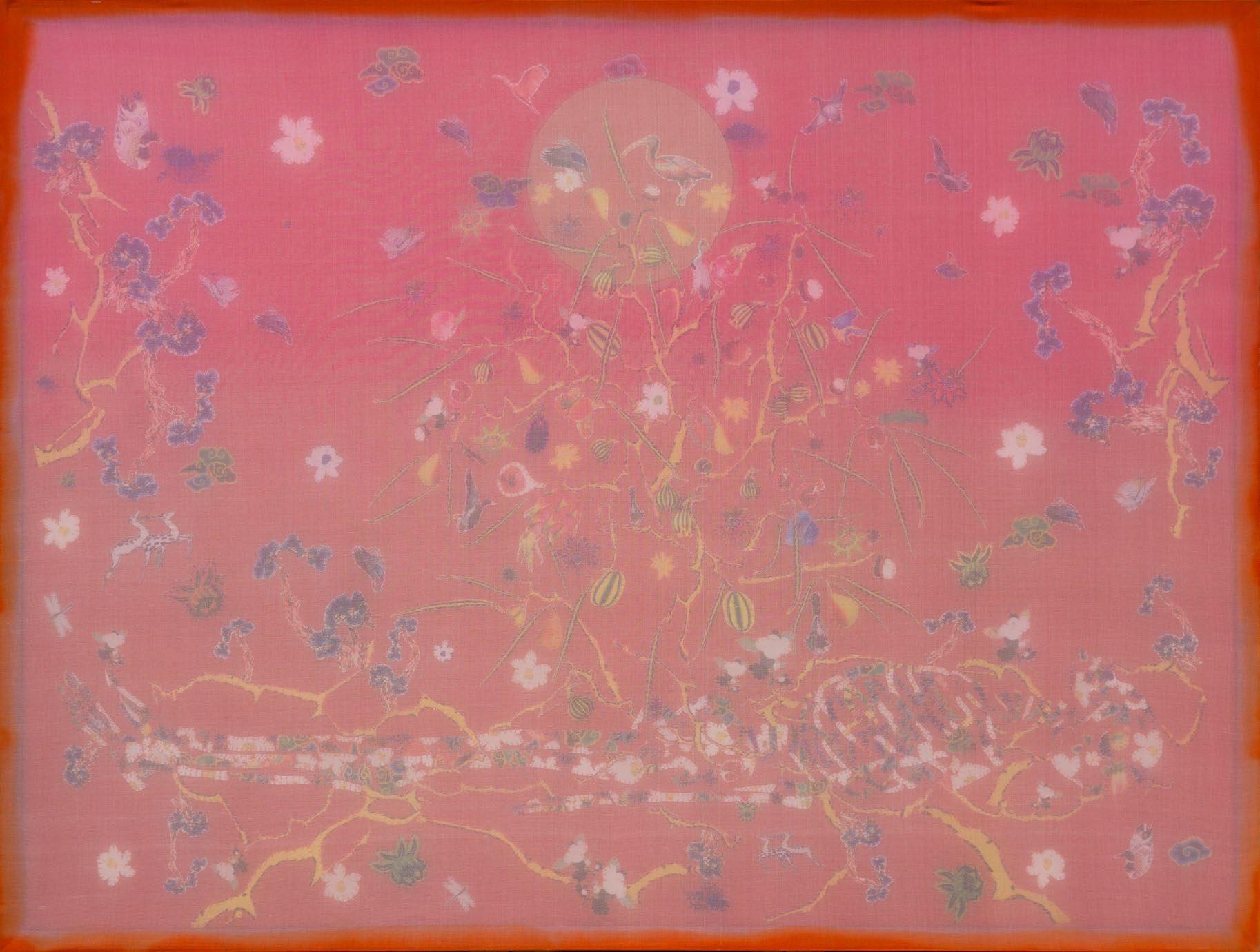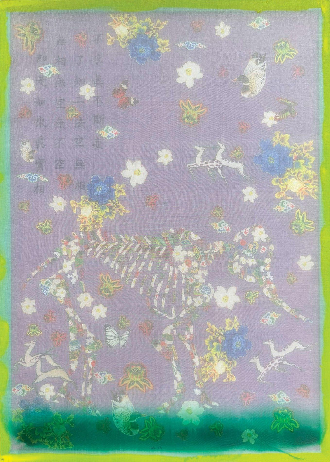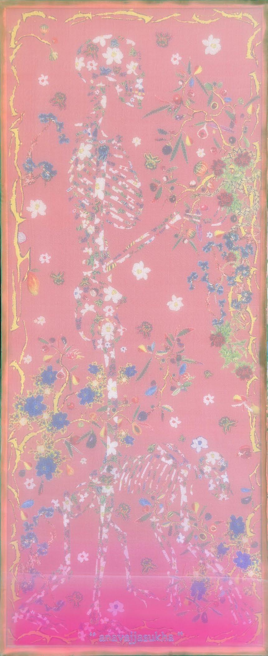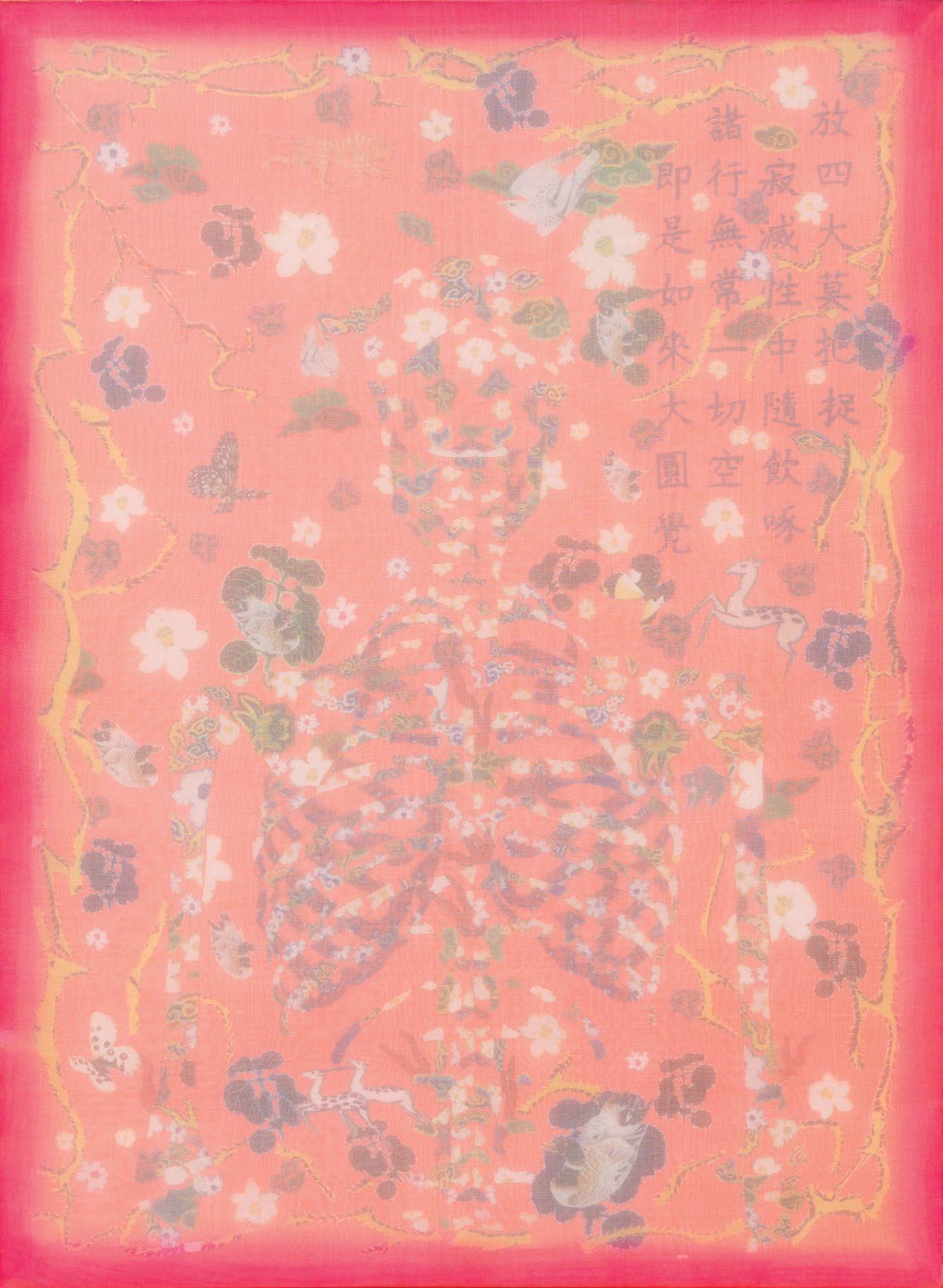 I observe the dissolution and reformation of distinct elements: skin, bones, living creatures, animals, and more. Not to analyze life and death; instead, each of these elements is crafted from floral-patterned fabric, representing their roots in nature.