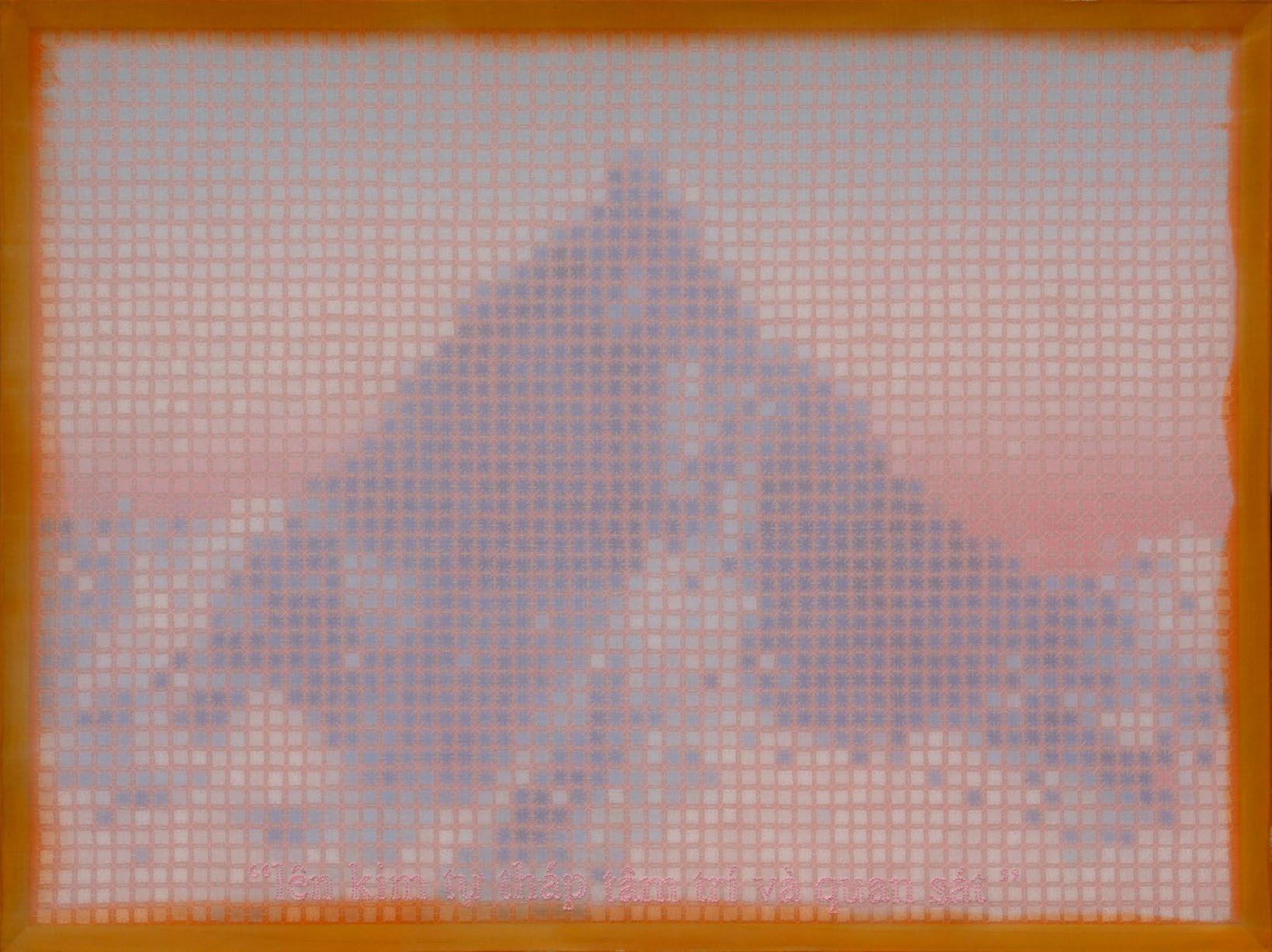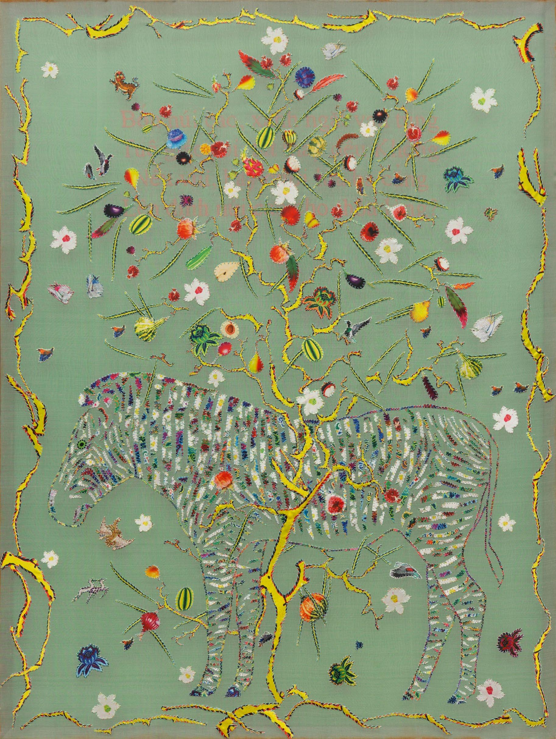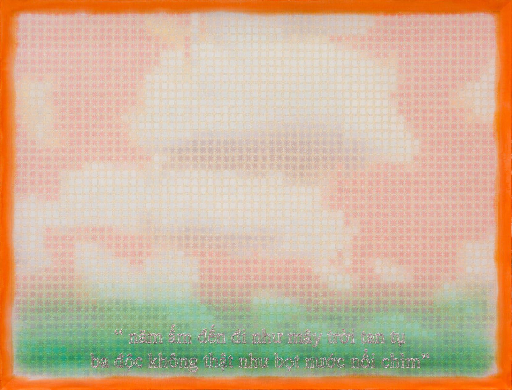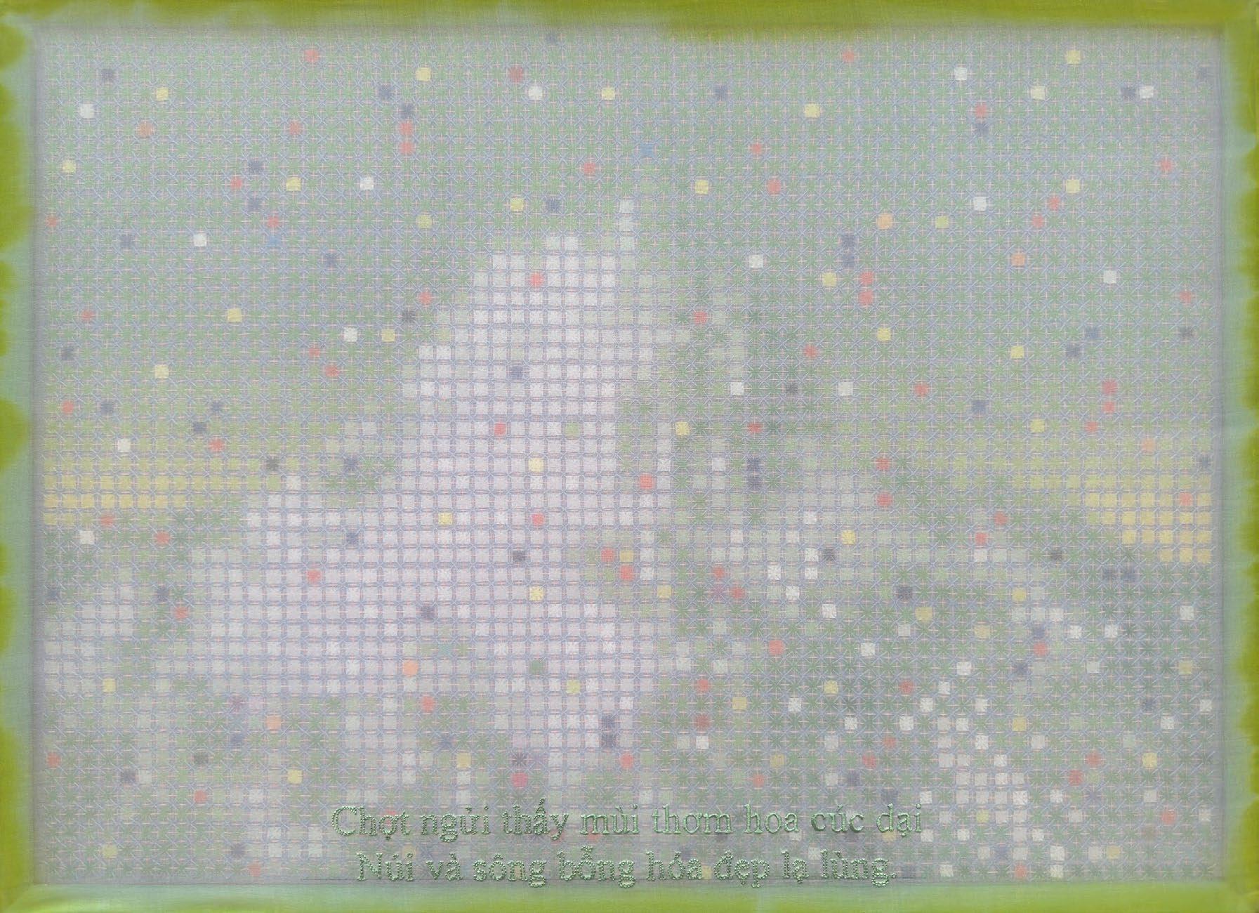 In works from this period, artist Doan Van Toi reflects on the interdependence of all things and the harmonious interaction between humans and nature. He observes all things with an equanimous and equal mind. Bones, pieces of skin, weapons, hunting trips, boat people, in essence, are all the same; they do not symbolize death, destruction, or anything else but simply represent a deep gaze into the inherent nature of nature itself. All material things, detached from their forms, cultural and social contexts, historical circumstances, are composed of the four great elements (earth, water, fire, wind of the universe) or molecular properties. Similarly, images of families are pieced together from various patterns, blending into each other without clear individual identities. They are all family and belong to each other. There are also times when he leads viewers through meditation language, verses, or the teachings of Zen masters and song lyrics to stroll along the riverbank, climb the mountain peak, where there are huts and white clouds flying not just to admire the scenery, listen to the sound of rain, and smell the fragrance of flowers but also to observe one’s body and emotions. Within nature one dwells, and within individuals nature dwells. There, hundreds of thousands of small colored squares dissolve into the vast space like drops of water merging into the ocean. Not a single drop is lost, they remain eternal. The three linears of images are separated but all calmly gaze deeply into the finite image of the object enabling it to fade into the limitless infinity.