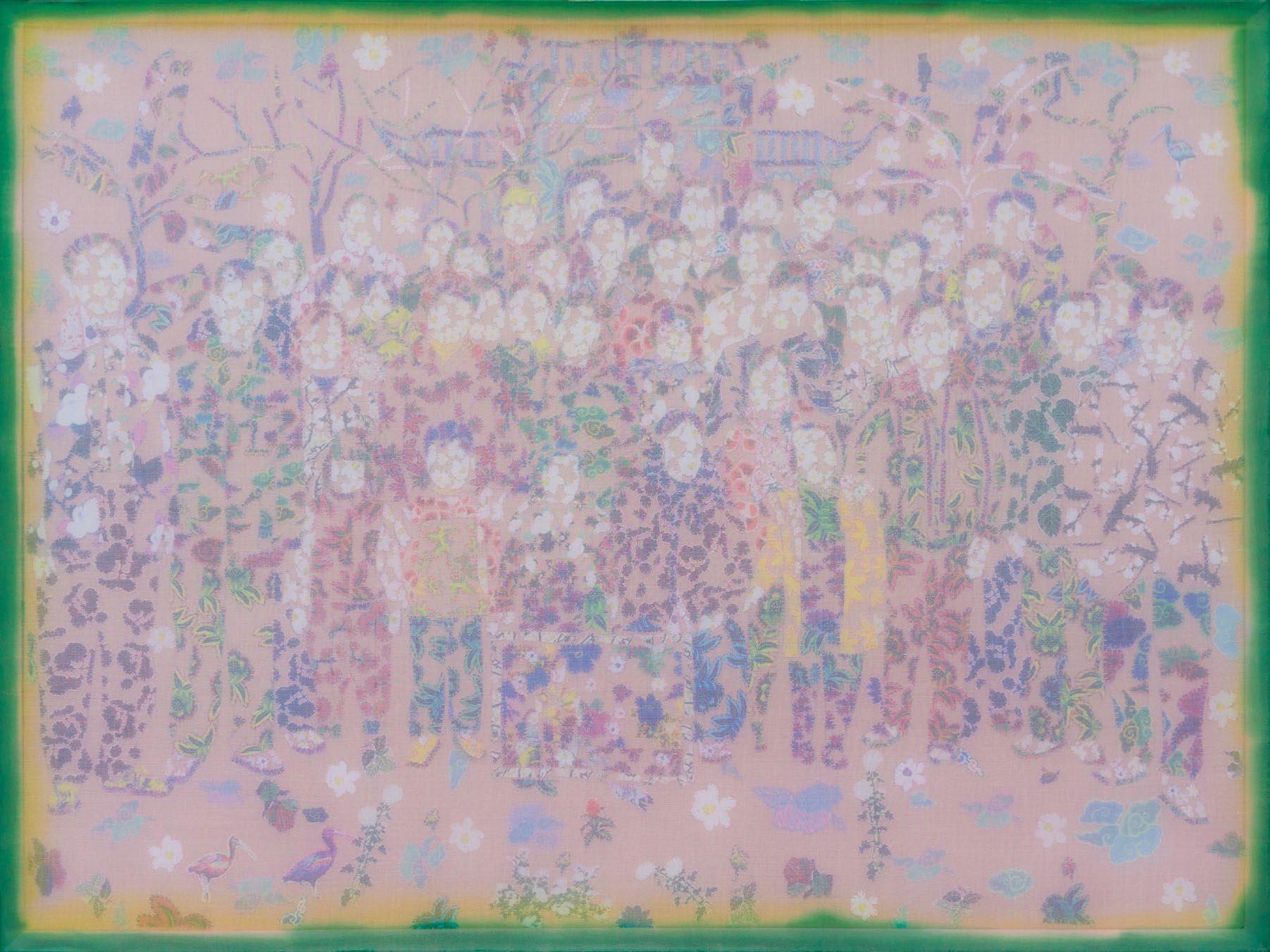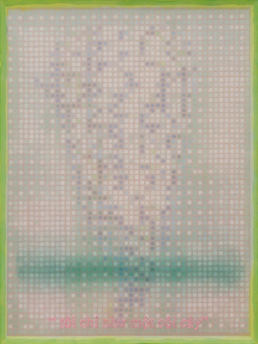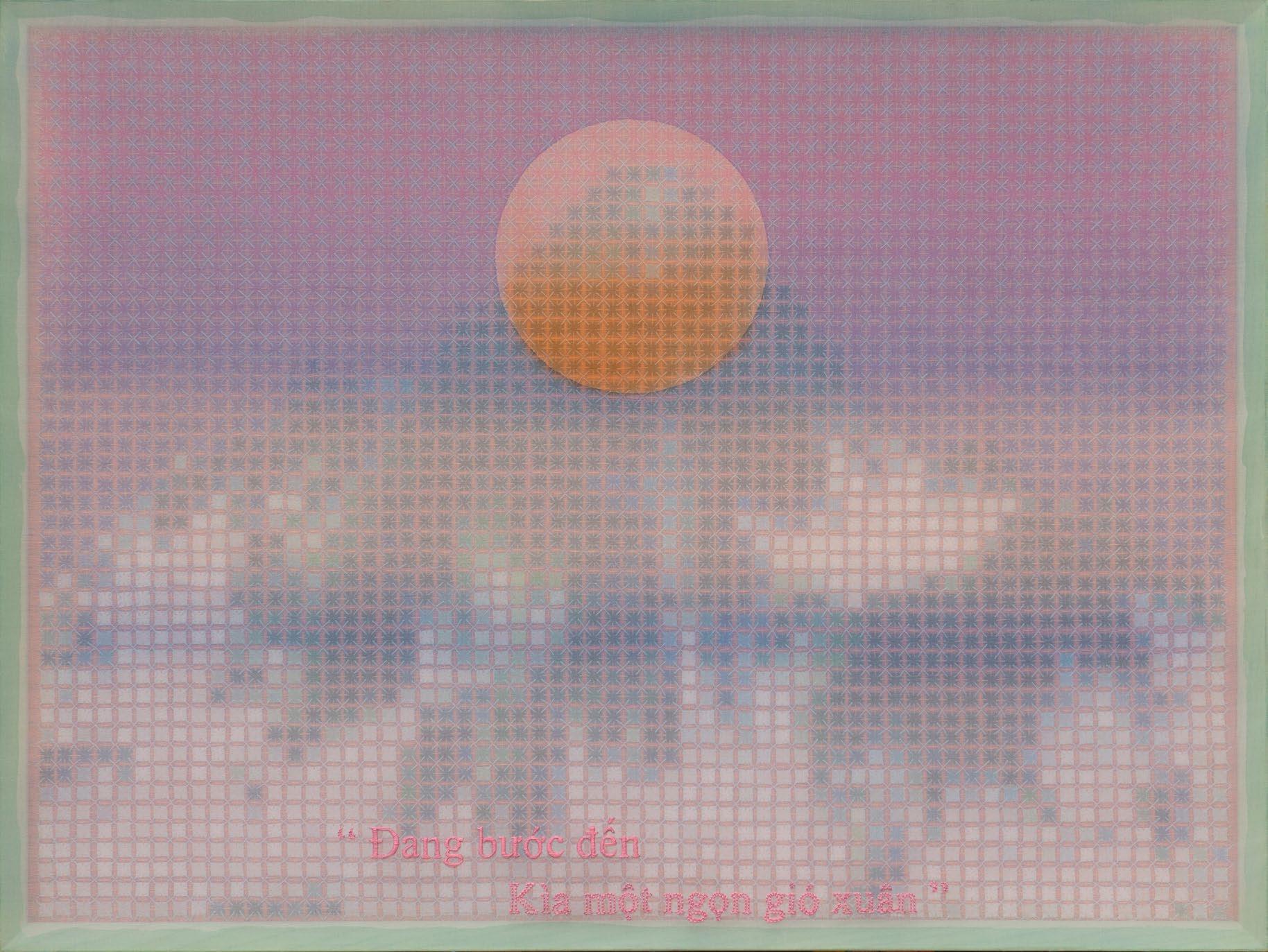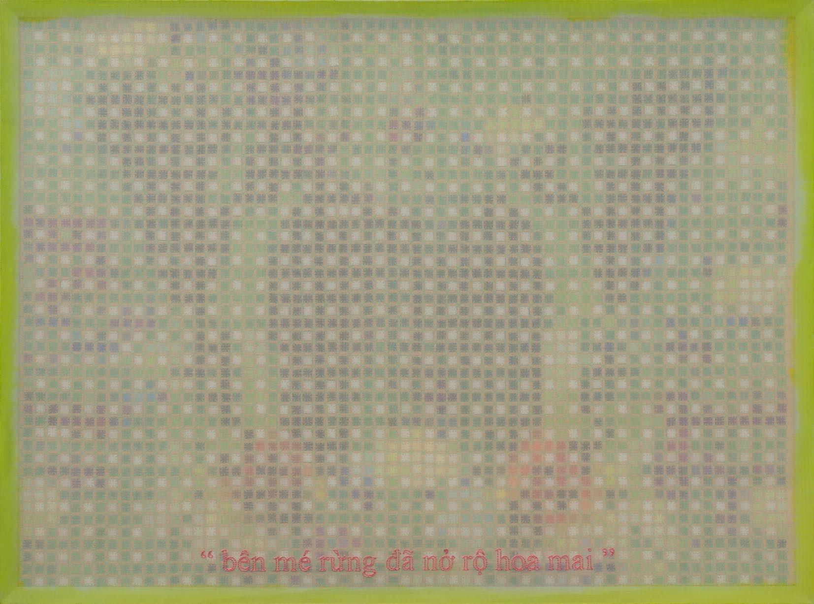 In works from this period, artist Doan Van Toi reflects on the interdependence of all things and the harmonious interaction between humans and nature. He observes all things with an equanimous and equal mind. Bones, pieces of skin, weapons, hunting trips, boat people, in essence, are all the same; they do not symbolize death, destruction, or anything else but simply represent a deep gaze into the inherent nature of nature itself. All material things, detached from their forms, cultural and social contexts, historical circumstances, are composed of the four great elements (earth, water, fire, wind of the universe) or molecular properties. Similarly, images of families are pieced together from various patterns, blending into each other without clear individual identities. They are all family and belong to each other. There are also times when he leads viewers through meditation language, verses, or the teachings of Zen masters and song lyrics to stroll along the riverbank, climb the mountain peak, where there are huts and white clouds flying not just to admire the scenery, listen to the sound of rain, and smell the fragrance of flowers but also to observe one’s body and emotions. Within nature one dwells, and within individuals nature dwells. There, hundreds of thousands of small colored squares dissolve into the vast space like drops of water merging into the ocean. Not a single drop is lost, they remain eternal. The three linears of images are separated but all calmly gaze deeply into the finite image of the object enabling it to fade into the limitless infinity.