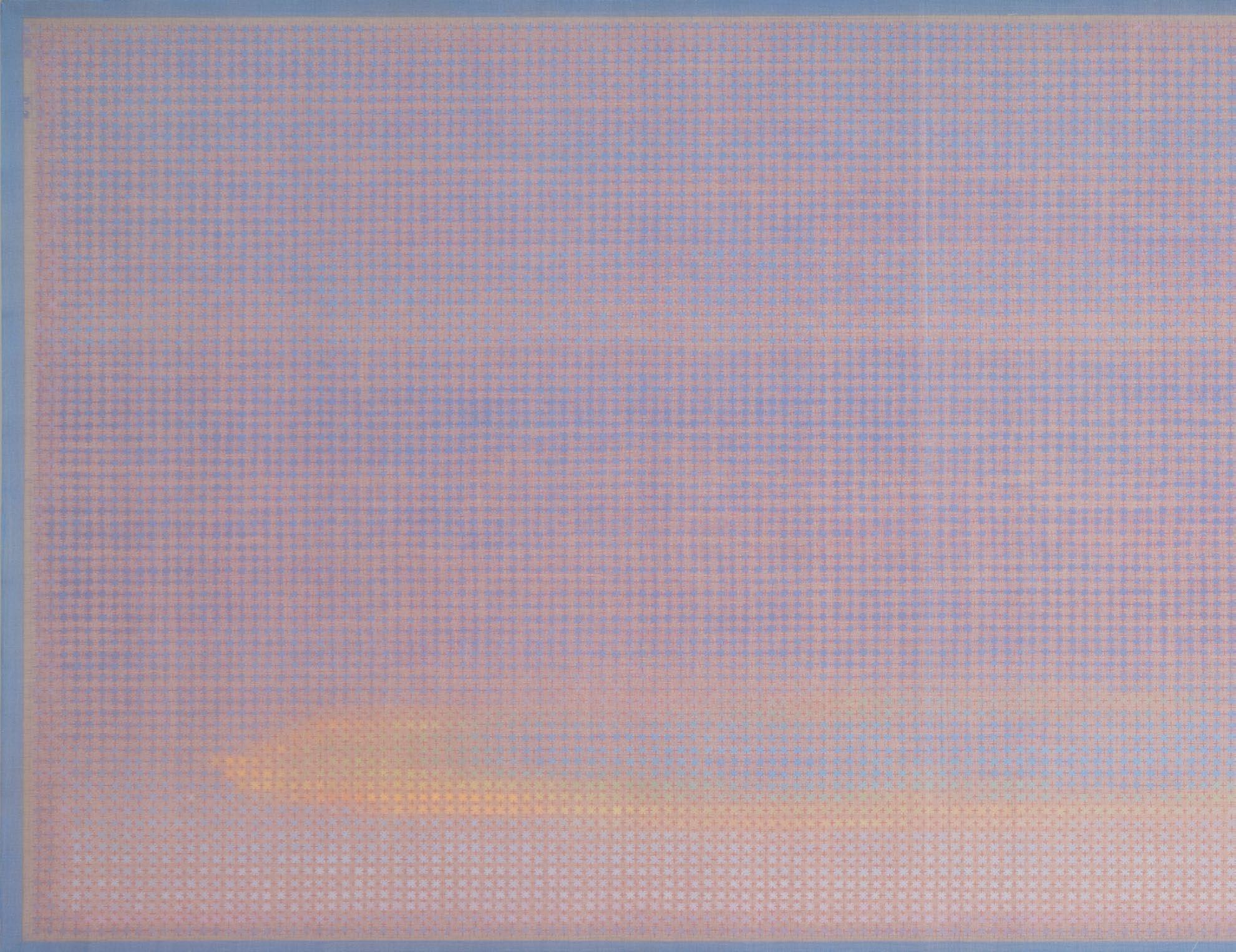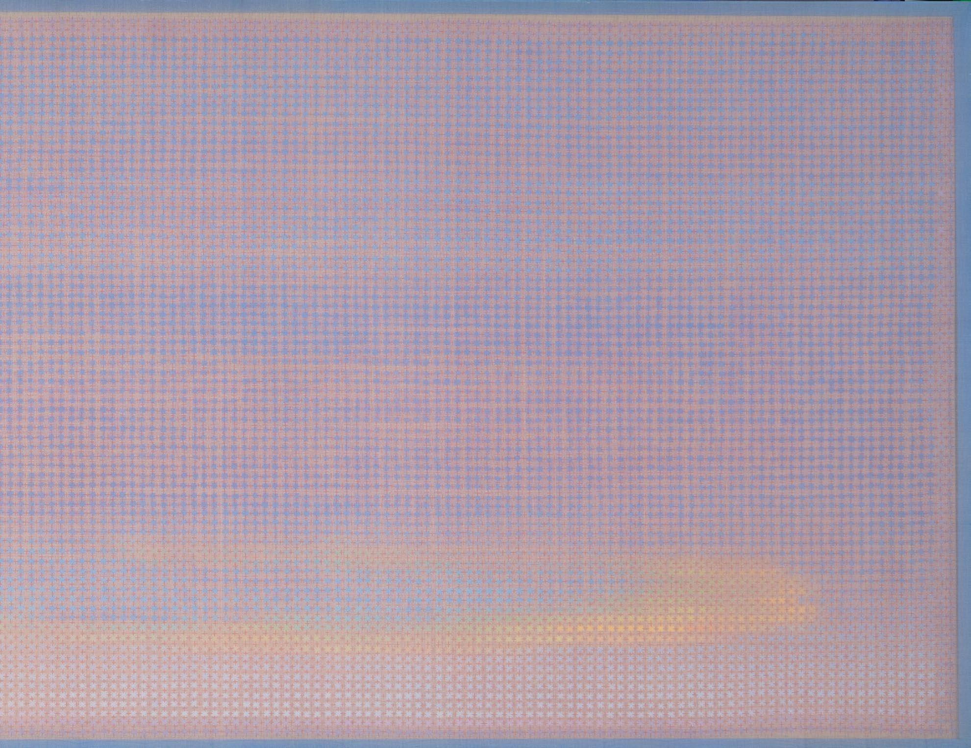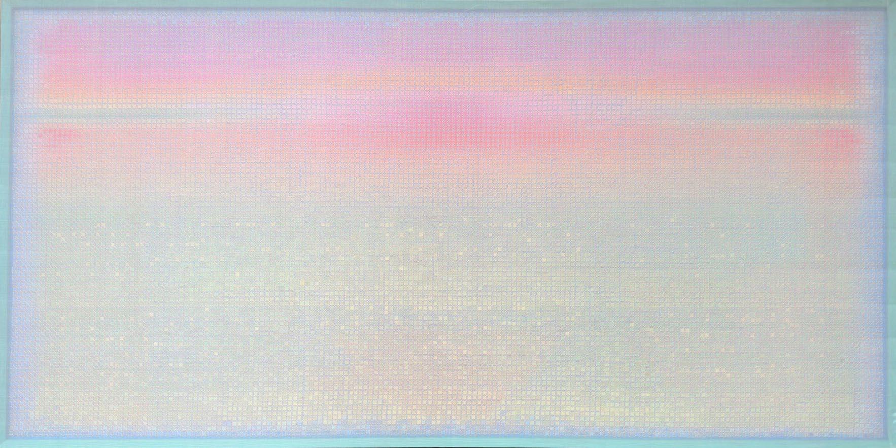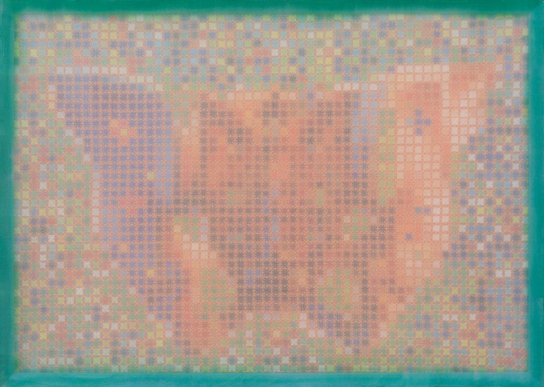 In works from this period, artist Doan Van Toi reflects on the interdependence of all things and the harmonious interaction between humans and nature. He observes all things with an equanimous and equal mind. Bones, pieces of skin, weapons, hunting trips, boat people, in essence, are all the same; they do not symbolize death, destruction, or anything else but simply represent a deep gaze into the inherent nature of nature itself. All material things, detached from their forms, cultural and social contexts, historical circumstances, are composed of the four great elements (earth, water, fire, wind of the universe) or molecular properties. Similarly, images of families are pieced together from various patterns, blending into each other without clear individual identities. They are all family and belong to each other. There are also times when he leads viewers through meditation language, verses, or the teachings of Zen masters and song lyrics to stroll along the riverbank, climb the mountain peak, where there are huts and white clouds flying not just to admire the scenery, listen to the sound of rain, and smell the fragrance of flowers but also to observe one’s body and emotions. Within nature one dwells, and within individuals nature dwells. There, hundreds of thousands of small colored squares dissolve into the vast space like drops of water merging into the ocean. Not a single drop is lost, they remain eternal. The three linears of images are separated but all calmly gaze deeply into the finite image of the object enabling it to fade into the limitless infinity.