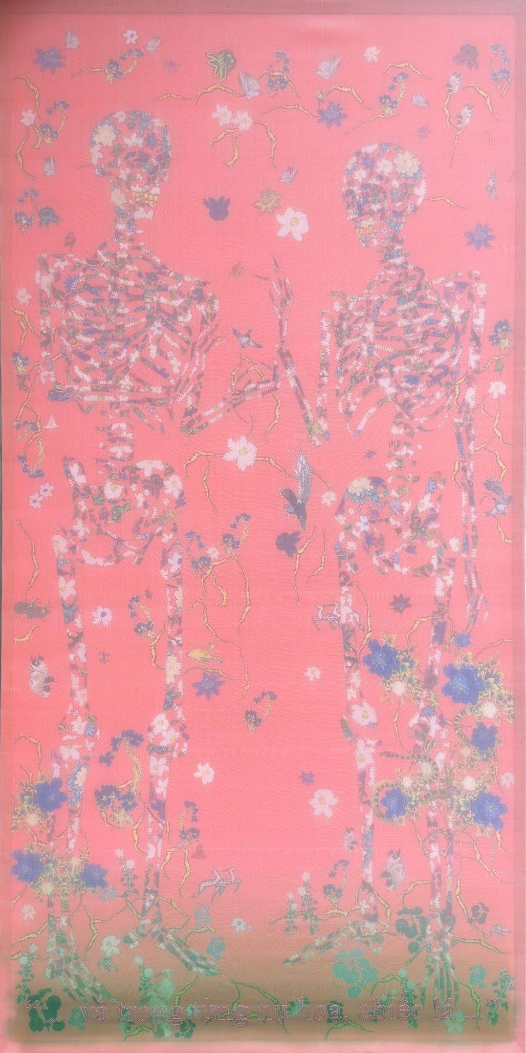 In the relationship with nature, I observe the dissolution and fusion of objects. I attempt to recreate this observation with countless pieces of fabric flowers stacked together: bones, skin, water surfaces, pebbles, mountains, families... Through deeper observation of the elements: forms, sounds, odors, tastes, tangibles, and mental objects, we see that they constantly arise, cease, regenerate, and continue. This is interdependent origination, where one thing arises due to the presence of another. When observing deeply, realizing there are no longer boundaries and differences between objects, we cultivate boundless compassion towards ourselves and external objects. We transform until we are no longer attached to their temporary differences, seeing ourselves and everything is interconnected. Instead of being caught in the impermanent changes of the past and future, when we accept everything as it is, when we no longer desire everything to operate according to our own will, that is the source of true love and true peace.