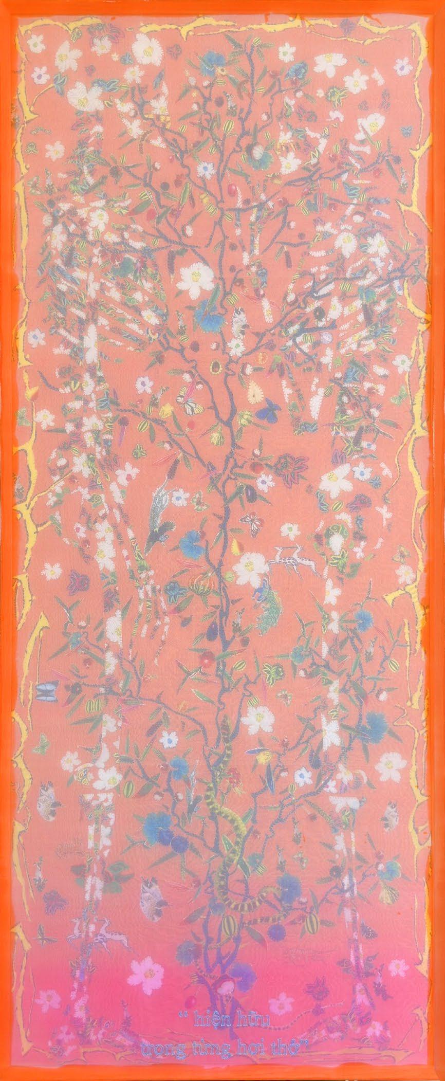 His artistic practice, if only seen through photographs, would be difficult to experience fully as in real life. He cuts many flowers, leaves, fabric squares, then arranges them to recreate or dissolve them into natural landscapes such as mountains, rivers, deep forests, and all kinds of creatures on the fabric surface. Embroidery method positioning and connecting images together. Each artwork is created by layering painted silk onto processed fabric, sometimes vice versa. These two layers are separated by a gap, where the images of both are harmonized, creating a dialogue with the viewer not only in the upper or lower layer but also producing a scene that is sometimes dim, sometimes bright, offering different visual effects from every angle. This is the continuation and development of the “Gate - Gate” series, combined with inspirations from calligraphy, stone inscriptions (Han characters carved on stone), and lyrics to incorporate written elements into the artwork. This process comes to him very naturally, whatever is needed will come, images and methods complement each other and are means to express the content.