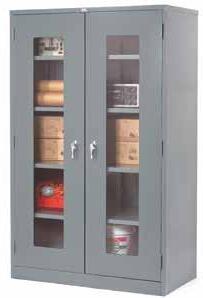 Industrial-grade 20-gauge steel body storage cabinets feature 4 adjustable shelves with a 300 lb. weight capacity per shelf. Cabinets are designed with channel reinforced, box-formed doors, 3-point latching mechanism with a strong 5/16" round locking bar for consistent alignment. Box-formed shelves adjust easily adjust with tool-free shelf clips. Cabinets feature dual chrome cast key locking handles for ease of closing. Right handle includes keyed alike cylinder lock with 2 keys. Counter height cabinets available in color gray. Add color suffix to Full Height Cabinets: Gray (GY), Black (BK), Tan (TN).