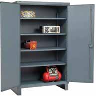 Heavy-Duty all-welded storage cabinets are constructed from thick 16-gauge steel. These cabinets are ideal for applications requiring a tough exterior and high capacity shelves. 4 shelves adjust on 3" centers, designed to support up to 1050 lbs. per shelf 3-point steel locking system locking system is operated by a 3/16" thick steel turn handle. Full door height piano hinges and padlockable lever handle for added strength and security. Durable gray powder coat finish. Fully assembled.
