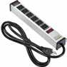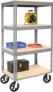 Heavy duty construction with 2,000 lb load capacity. Adjustable height 16 gauge steel shelves and 12 gauge steel legs. Features tension frame construction to prevent sway. Top shelf has 2 knockouts that accept duplex or plug-in outlets.