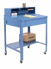 Create convenient workspaces in warehouses, receiving areas, and more with these industrial-grade shop and shipping desks. Constructed from rugged channel-reinforced steel, these desks feature a durable work surface, storage shelving compartments, a lockable drawer with steel ball bearings, heightadjustable feet for fighting fatigue, and knockout outlets for easy electrical access. Desks come standard with top compartment, drawer, bottom shelf, and knockout outlet. Desk measures 341/2”W x 30” D and adjusts from 38”H up to 421/2”H. Optional pegboard measures 281/2” H.