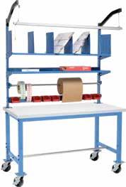 The complete packing workbench includes a riser kit, and lower shelf kit. This workbench is supported by heavy-duty 2” square 14 gauge steel tubular legs that adjust from 29-7/8 - 41-3/4”H at 2” increments and are tested to capacity of 5000 lbs for stationary and 2000 lbs. for mobile. It includes adjustable leveling floor glides and leveling foot plates that allow floor anchoring. This workbench has a powder coat finish, and it is quick and easy to assemble. The riser kit includes 48”H uprights, bin rail, reel holder, two 12” depth shelves (1 with 6 adjustable carton dividers), and a 72”W LED light kit. The lower shelf kit measures 25”D with 4 carton dividers and a has 5”H storage shelf.