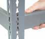 This cost-effective, sturdy metal storage rack offers almost twice the capacity per level as standard racks thanks to the formed step Z-beam. The boltless design allows the horizontal beams to be easily installed and quickly adjusted at 2” increments. Heavy-duty, 12-gauge beams have 3 hooks at each end for positive connection. Uprights are 14-gauge steel measuring 13/4” x 13/4”. Gray powder coat finish. Easy assembly.