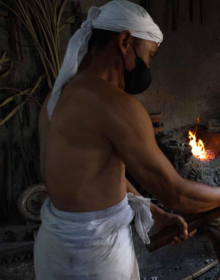 We noticed how the forging activities that took place in Baselan gave the impression of being in the past in Java. Moreover, there are many chopsticks on the walls of Besalen, a type of long pliers, which are used to clamp the blade of the keris when it is burned. The forging process is not an easy matter, therefore the panjak in charge of burning the blade must concentrate on controlling the size of the embers to ensure the level of heat. Even though it is only a stove, the kiln remains a concern for the management. To add to the attractiveness of the burning place, it is decorated with carvings of the head of a kala (giant) and when the burning process takes place, sparks can be seen rising up, throwing ashes from burning charcoal. Panjak must also ensure that the two blades of the kris receive the same handling so that they need to be turned over in hot coals. The blade of the keris is sometimes dipped into a stone cup filled with a certain liquid repeatedly, of course, to get a high quality kris.