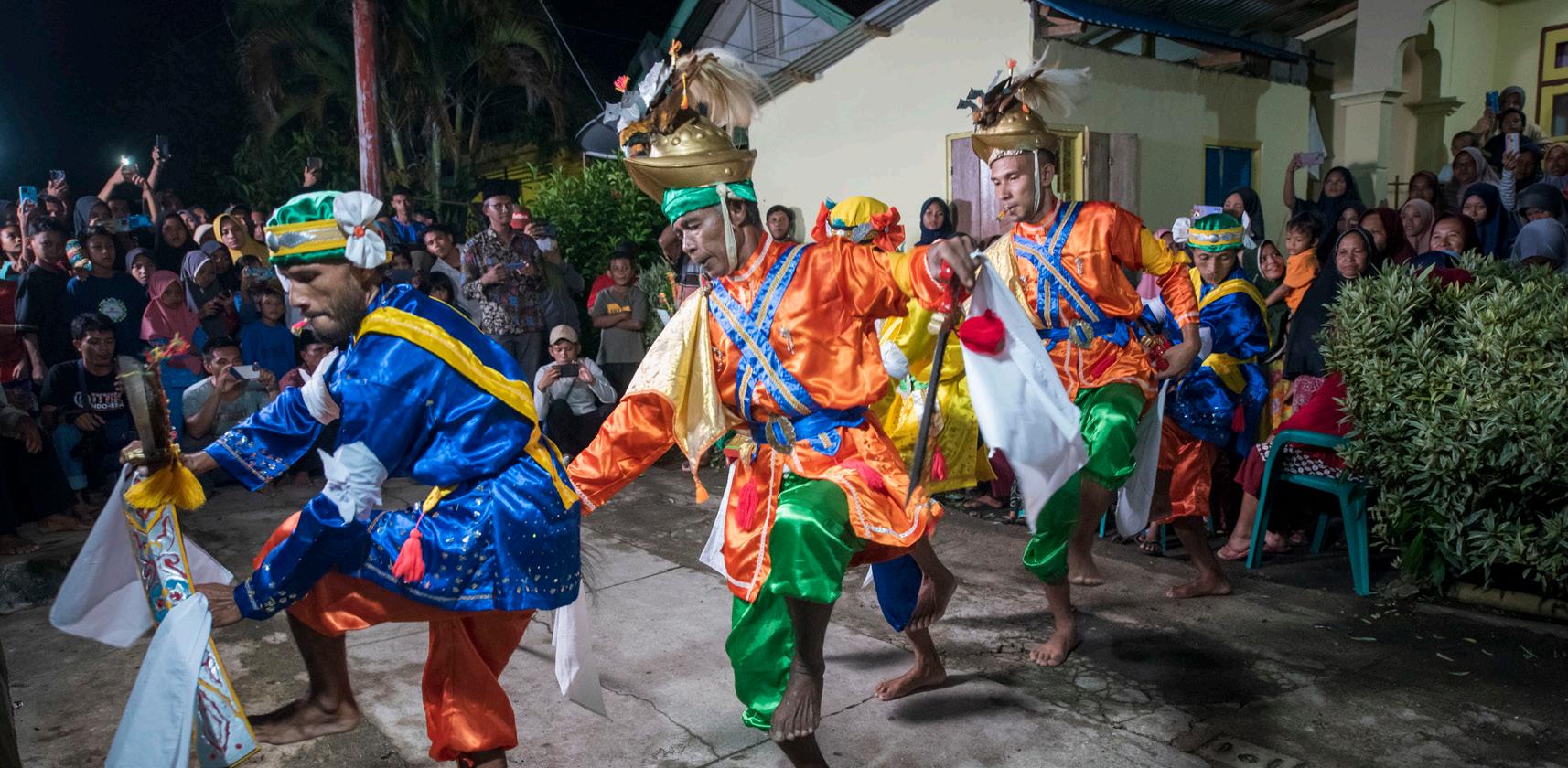The community holds the buka puang ritual – namely opening of the coconut flower, cutting and installing bamboo for the ceremonial archway and gate – two days before the peak of the celebration. The opened puang (coconut flower) is placed in the traditional houses next to heirlooms, cakalele dance attributes, and belang kora-kora attributes. This is in fact the essence of the village opening ritual. After buka puang, the cakalele warrior dance is performed and belang kora-kora regatta is carried out as the peak of the celebration to commemorate the spice route, which represents strength and patriotism in fighting the colonial power in the past. On special holidays, the people of Banda Neira welcome the people of Banda Eli who live in the Kei Islands, Southeast Maluku, who migrated four centuries ago. The cakalele dance at the Mini Palace in Banda Neira is usually livelier because the dancers come from various regions in Maluku. The ritual ends by closing the village. After that, cakalele attributes and belang kora-kora attributes are to be put away and stored, while the dance and the regatta may not be performed again until the next village opening ritual.