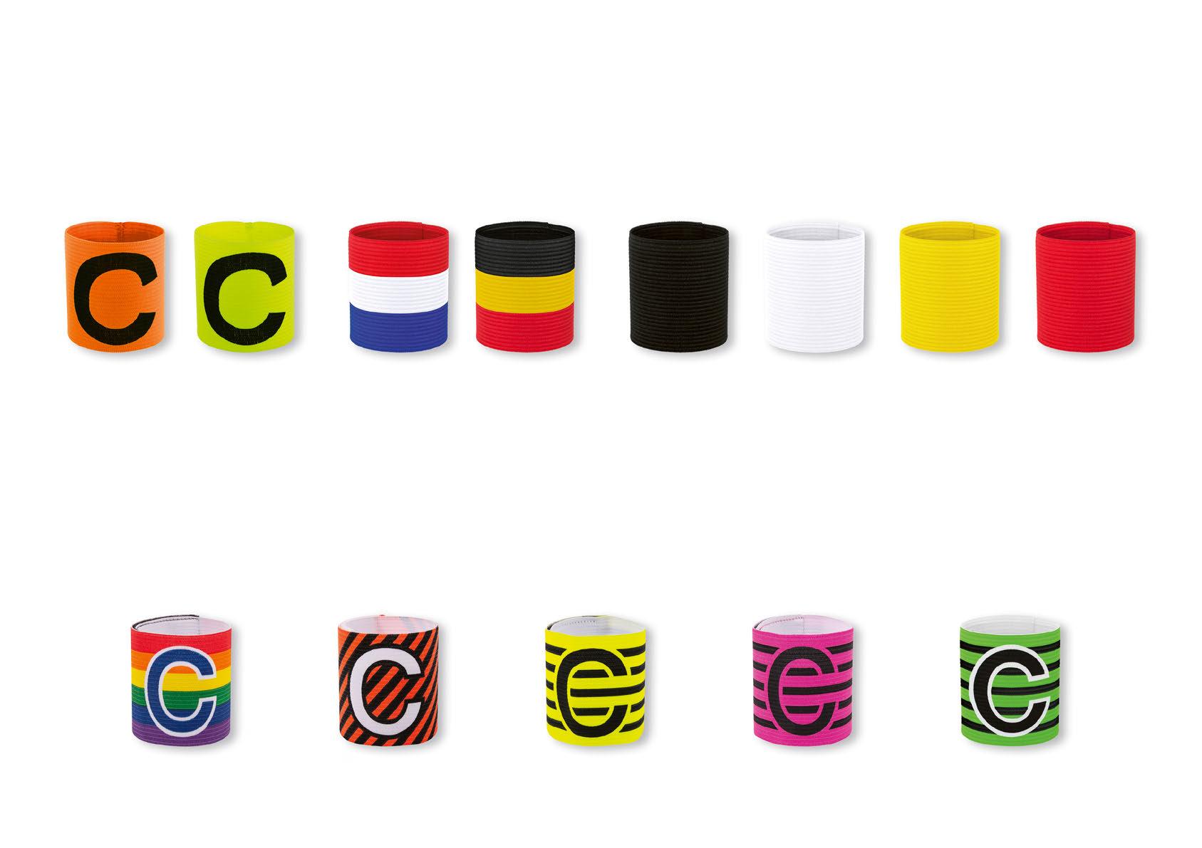 Diese elastische Kapitänsbinde hat einen größenverstellbaren Klettverschluss und trägt den Buchstaben C. Sie ist in verschiedenen Mustern verfügbar.