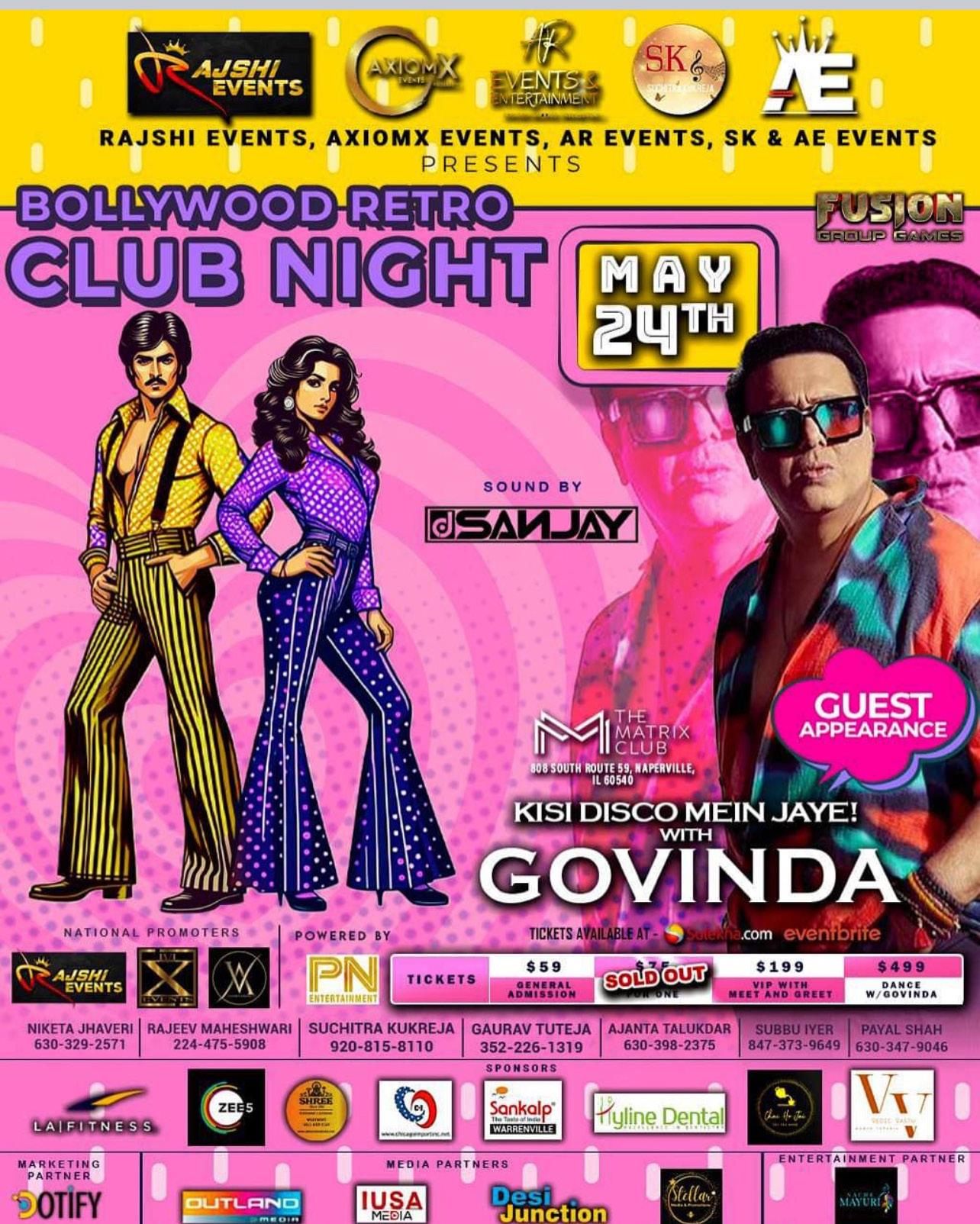 The legendary king of Indian cinema comedy and dance, Govinda, will grace Chicago with his presence in a sold-out show tonight, May 24, at the Matrix Club in Naperville, Illinois. The event, titled “Bollywood Retro Club Night,” is hosted by Gaurav Tuteja of Rajshi Events and promises to be a night of unforgettable entertainment. The excitement kicked off the night before, on May 23rd, with a highly anticipated press meet and greet that attracted members of the Chicago media as well as local and international promoters. This event provided a unique opportunity for the media to interact with the beloved superstar and delve into his illustrious career.