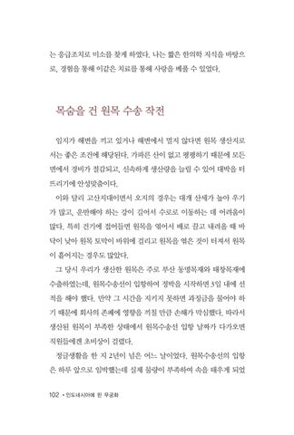 목숨을 건 원목 수송 작전 임지가 해변을 끼고 있거나 해변에서 멀지 않다면 원목 생산지로 서는 좋은 조건에 해당된다. 가파른 산이 없고 평평하기 때문에 모든 면에서 경비가 절감되고, 신속하게 생산량을 늘릴 수 있어 대박을 터 뜨리기에 안성맞춤이다. 이와 달리 고산지대이면서 오지의 경우는 대개 산세가 높아 우기 가 많고, 운반해야 하는 강이 길어서 수로로 이동하는 데 어려움이 많다. 특히 건기에 접어들면 원목을 엮어서 배로 끌고 내려올 때 바 닥이 낮아 원목 토막이 바위에 걸리고 원목을 엮은 것이 터져서 원목 이 흩어지는 경우도 많았다. 그 당시 우리가 생산한 원목은 주로 부산 동명목재와 태창목재에 수출하였는데, 원목수송선이 입항하여 정박을 시작하면 3일 내에 선 적을 해야 했다. 만약 그 시간을 지키지 못하면 과징금을 물어야 하 기 때문에 회사의 존폐에 영향을 끼칠 만큼 손해가 막심했다. 따라서 생산된 원목이 부족한 상태에서 원목수송선 입항 날짜가 다가오면 직원들에겐 초비상이 걸렸다. 정글생활을 한 지 2년이 넘은 어느 날이었다. 원목수송선의 입항 은 하루 앞으로 임박했는데 실제 물량이 부족하여 속을 태우게 되었 102 •인도네시아에 핀 무궁화