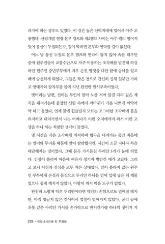 라가야 하는 경우도 있었다. 이 강은 높은 산악지대에 있어서 아주 조 용했다. 산림개발 현장 본부 캠프와 제2캠프 사이는 아주 멀리 떨어져 있어 통신이 두절되든가, 길이 막히면 본부와 연락할 길이 없었다. 어느 날 통신 두절로 본부 캠프와 연락이 닿지 않아 속을 태우던 중에 원주민들이 교통수단으로 자주 이용하는 조각배를 발견해 하강 하던 원주민 중년부부에게 겨우 손짓 발짓을 다한 끝에 승낙을 얻고 배에 승선하게 되었다. 그들은 작은 천으로 간신히 신체 일부만 가리 고 망태기와 칼자루를 몸에 지닌 완전한 원시부족이었다. 뱃머리는 남편, 선미는 부인이 맡아 노를 저어 물결 따라 깊은 계 곡을 내려가는데 울창한 산림 속에서 까마귀가 기분 나쁘게 까악까 악 하고 울었다. 언제 물에 휩쓸릴지 모르는 조그마한 조각배에 몸을 의지하고 내려가면서 나는 어쩌다가 이런 오지에까지 와서 이런 고 생을 하나 하는 처량한 생각이 들었다. 몇 시간을 작은 조각배에 의지하여 협곡을 내려가는 동안 처음에 는 멀미와 두려움 때문에 앞이 캄캄했지만, 시간이 조금 지나자 차츰 대담해지는 것이었다. 그때 문득 가시돋친 두리안 3개가 눈에 띄었 다. 긴장이 풀리며 마음에 여유가 생기자 별안간 배가 고팠다. 그러 고 보니 아침과 점심을 모두 거른 상태였다. 말이 통하지 않는 원주 민 부부에게 손짓과 몸짓으로 두리안 하나를 얻어 입에 넣은 뒤 깨물 었으나 쉽게 깨지지 않았다. 마땅히 깨서 먹을 도구가 없었다. 완전히 노랗게 익은 두리안이라면 약간의 손힘으로도 벌어질 테지 만, 아직 영글지 않은 것이어서 껍질이 벌어지지 않았다. 궁리 끝에 쇠못 같은 두리안 가시를 손가락으로 반시간가량 하나씩 짓이겨 겨 278 •인도네시아에 핀 무궁화