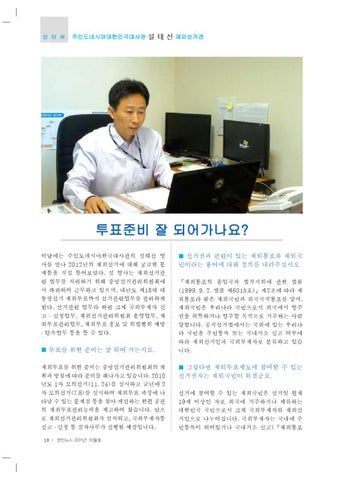 투표준비 잘 되어가나요? 이달에는 주인도네시아한국대사관의 설태선 영 사를 만나 2012년의 재외선거에 대해 궁금한 문 제들을 직접 들어보았다. 설 영사는 재외선거관 련 업무를 처리하기 위해 중앙선거관리위원회에 서 파견되어 근무하고 있으며, 내년도 제18대 대 통령선거 재외투표까지 선거관련업무를 관리하게 된다. 선거관련 업무라 하면 크게 국외부재자 신 고 . 신청업무, 재외선거관리위원회 운영업무, 재 외투표관리업무, 재외투표 홍보 및 위법행위 예방 . 단속업무 등을 들 수 있다. ■ 투표를 위한 준비는 잘 되어 가는지요. 재외투표를 위한 준비는 중앙선거관리위원회의 계 획과 방침에 따라 준비를 해나가고 있습니다. 2010 년도 1차 모의선거(11. 24)를 실시하고 금년에 2 차 모의선거(7.8)를 실시하여 재외투표 과정에 나 타날 수 있는 문제점 등을 찾아 개선하는 한편 공관 의 재외투표관리능력을 제고하여 왔습니다. 앞으 로 재외선거관리위원회가 설치되고, 국외부재자등 신고 . 신청 등 절차사무가 진행될 예정입니다. 18 I 한인뉴스 2011년 10월호