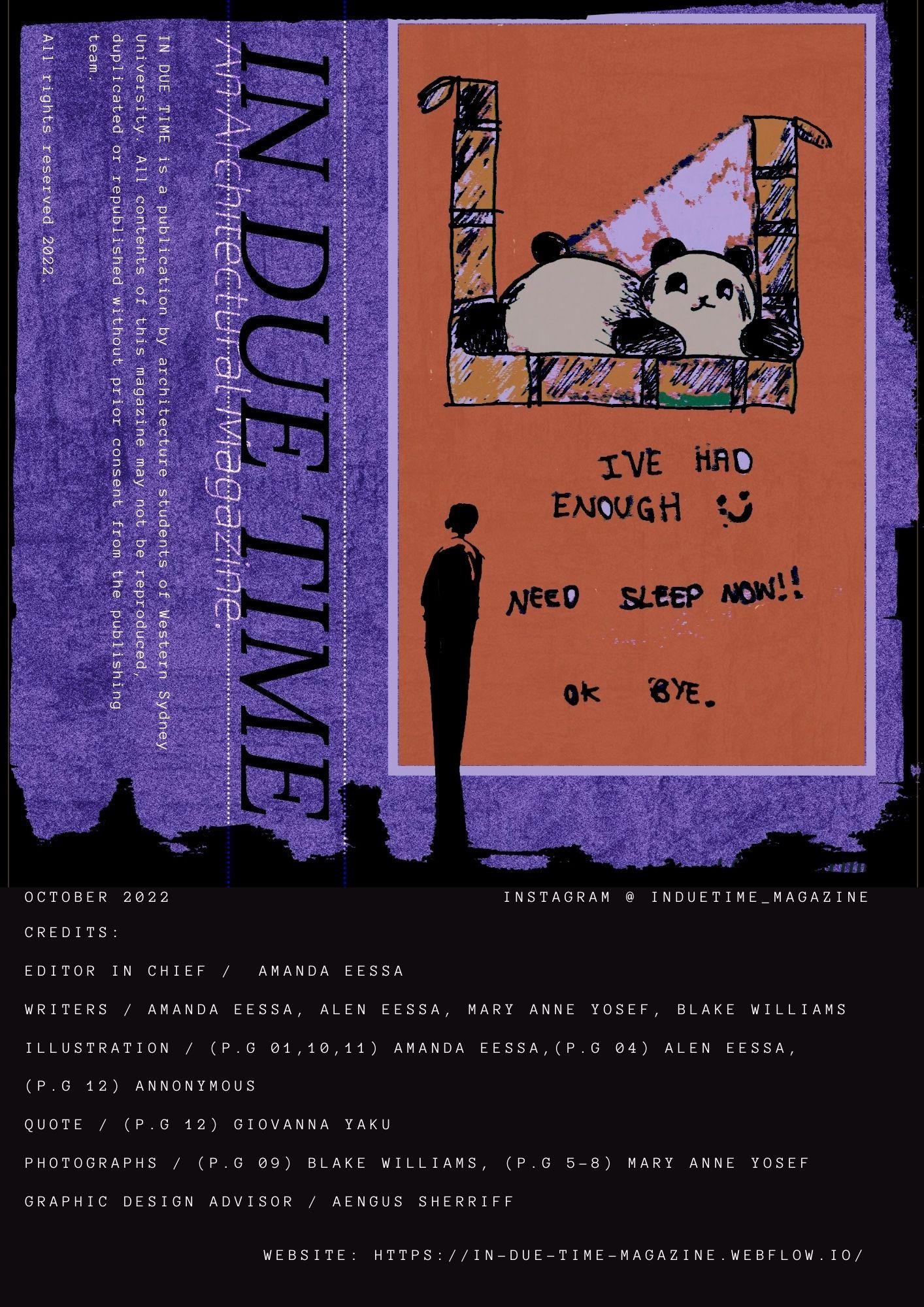 Issue 01 of In Due Time Magazine presents the beginning of a new architectural legacy of Sydney. Brought together by students passionate about designing for the Western Sydney landscape and re-inventing the perceptions and assumptions of our home. This issue features works from current architecture students, alumni's and experienced designers.