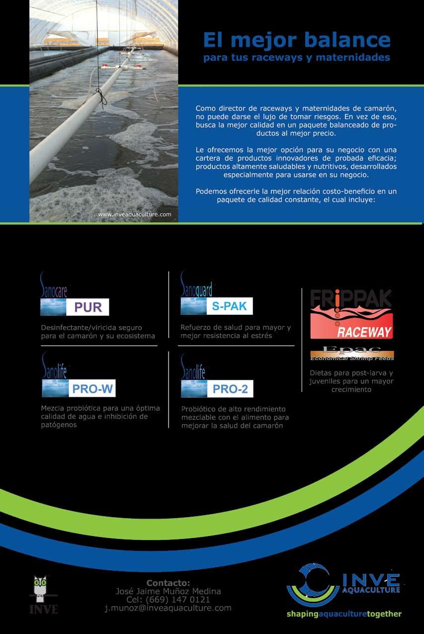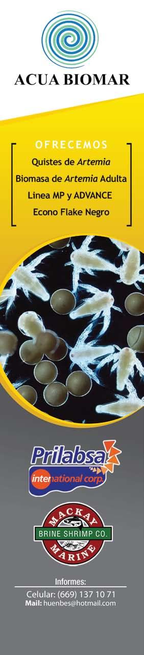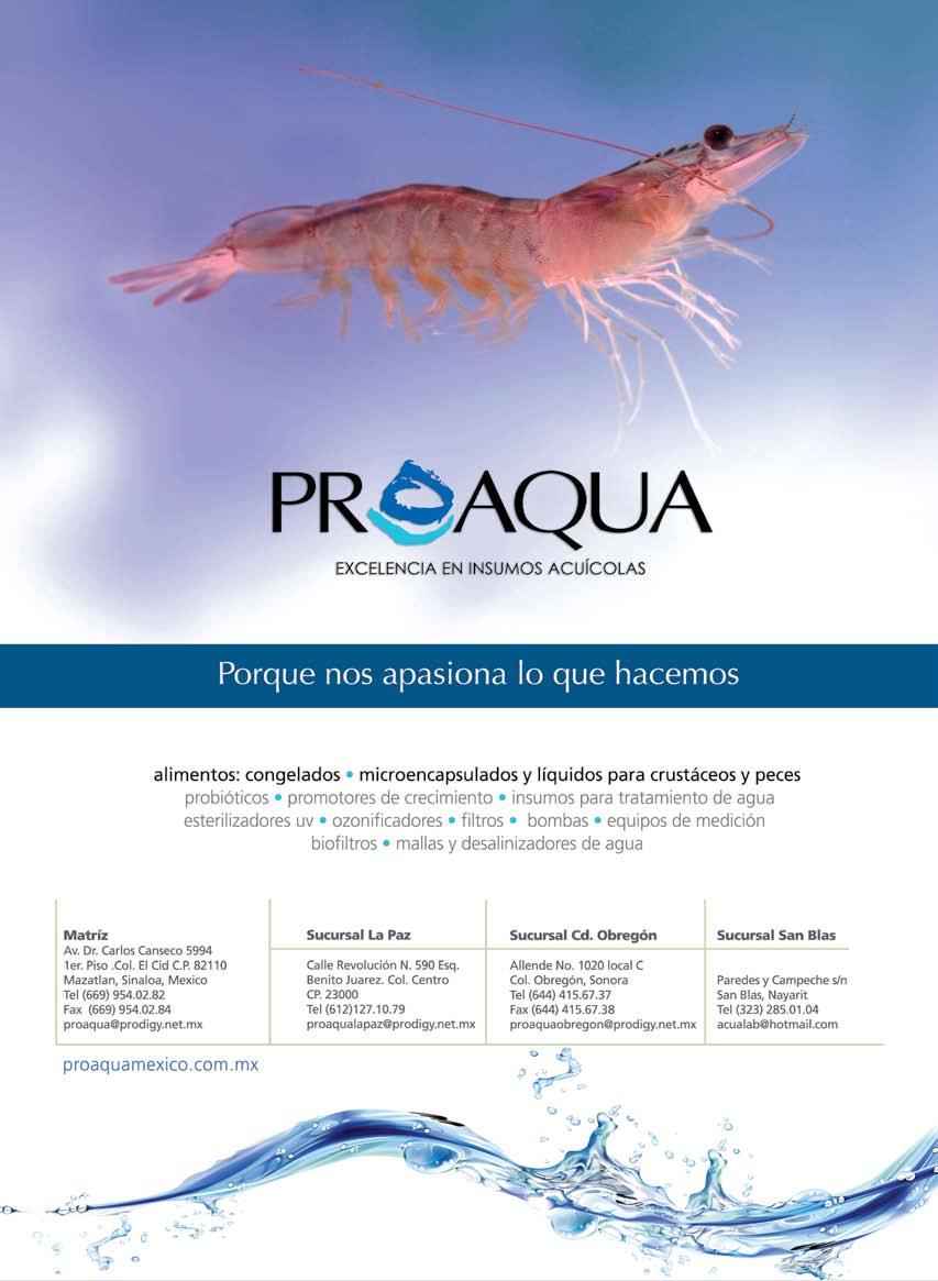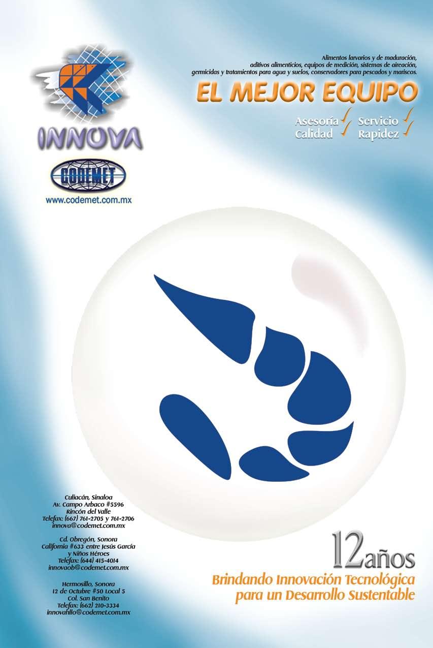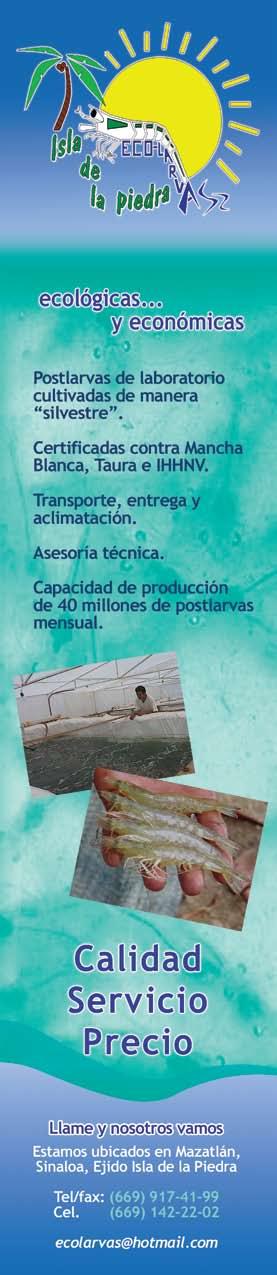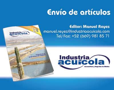 La publicidad y promociones de las marcas aquí anunciadas son responsabilidad de las propias empresas. La información, opinión y análisis de los artículos contenidos en esta publicación son responsabilidad de los autores y no refleja, necesariamente, el criterio de esta editorial. INDUSTRIA ACUÍCOLA, Revista bimestral, Enero 2013. Editor responsable: Manuel de Jesús Reyes Fierro. Número de Certificado de Reserva otorgado por el Instituto Nacional del Derecho de Autor: 04-2007-100211233500. Número de Certificado de Licitud de Contenido: 11574 y número de Certificado de Licitud de Título: 14001, emitidos por la Secretaría de Gobernación. Registro Postal PP25-0003. Domicilio de la Publicación: De Las Torres No. 202, Col. José Gordillo Pinto C.P. 82136, Mazatlán Sinaloa, Mazatlán, Sinaloa. Impresión: Imprenta El Debate.