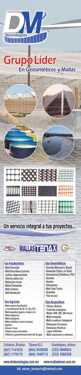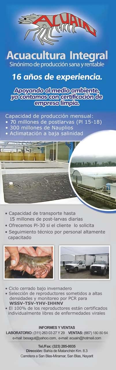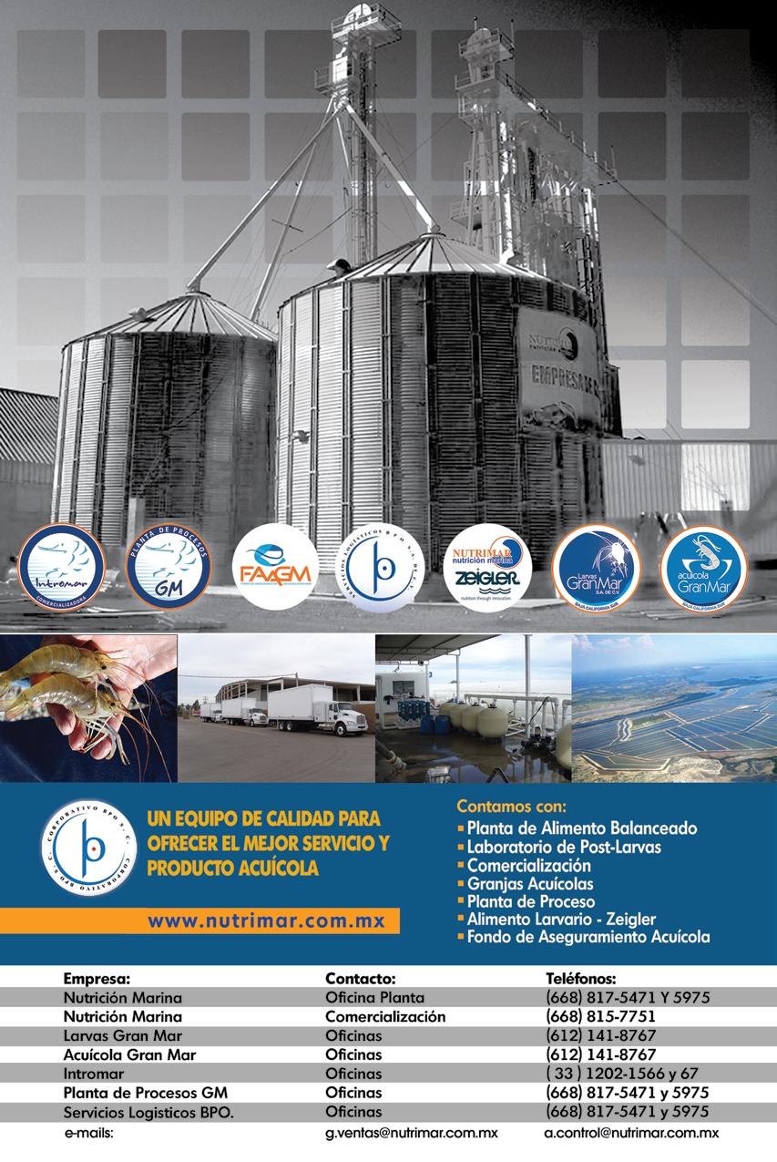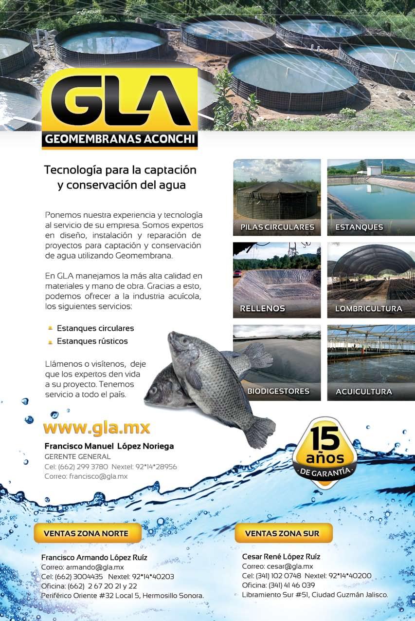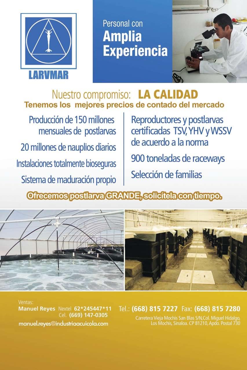 La publicidad y promociones de las marcas aquí anunciadas son responsabilidad de las propias empresas. La información, opinión y análisis de los artículos contenidos en esta publicación son responsabilidad de los autores y no refleja, necesariamente, el criterio de esta editorial. INDUSTRIA ACUÍCOLA, Revista bimestral, Enero 2013. Editor responsable: Manuel de Jesús Reyes Fierro. Número de Certificado de Reserva otorgado por el Instituto Nacional del Derecho de Autor: 04-2007-100211233500. Número de Certificado de Licitud de Contenido: 11574 y número de Certificado de Licitud de Título: 14001, emitidos por la Secretaría de Gobernación. Registro Postal PP25-0003. Domicilio de la Publicación: De Las Torres No. 202, Col. José Gordillo Pinto C.P. 82136, Mazatlán Sinaloa, Mazatlán, Sinaloa. Impresión: Imprenta El Debate.