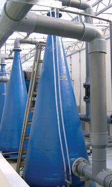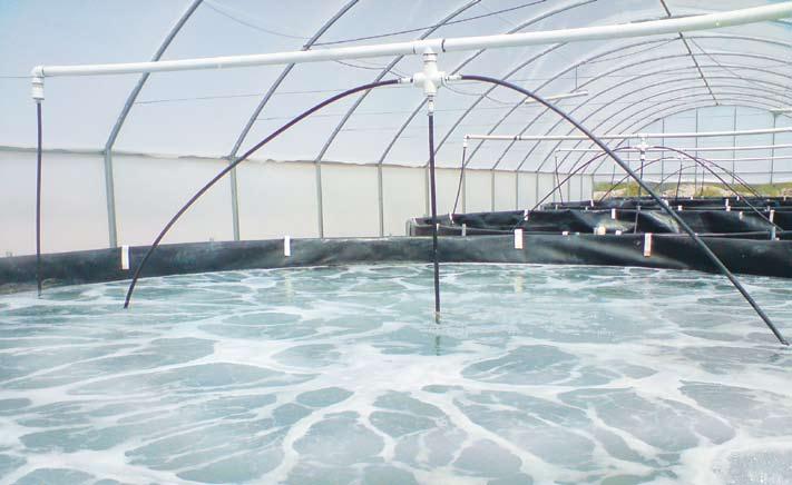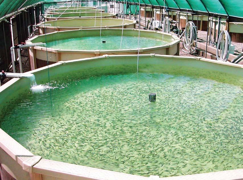 Fig. 1. Tanques de reproductores de cobia en la instalación de producción de juveniles de Marine Farms Belize. En los dos intermedios se observan los tanques cilindro-cónicos de colecta de los huevos por rebozo (cortesía de J. Alarcón, Marine Farms Belize).