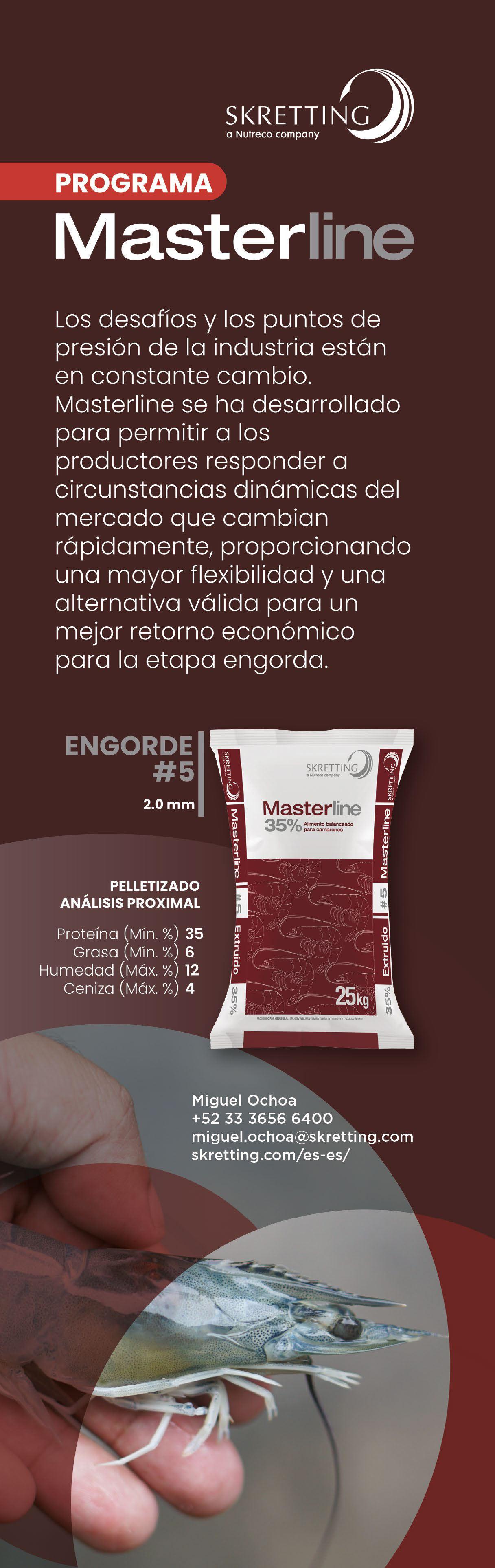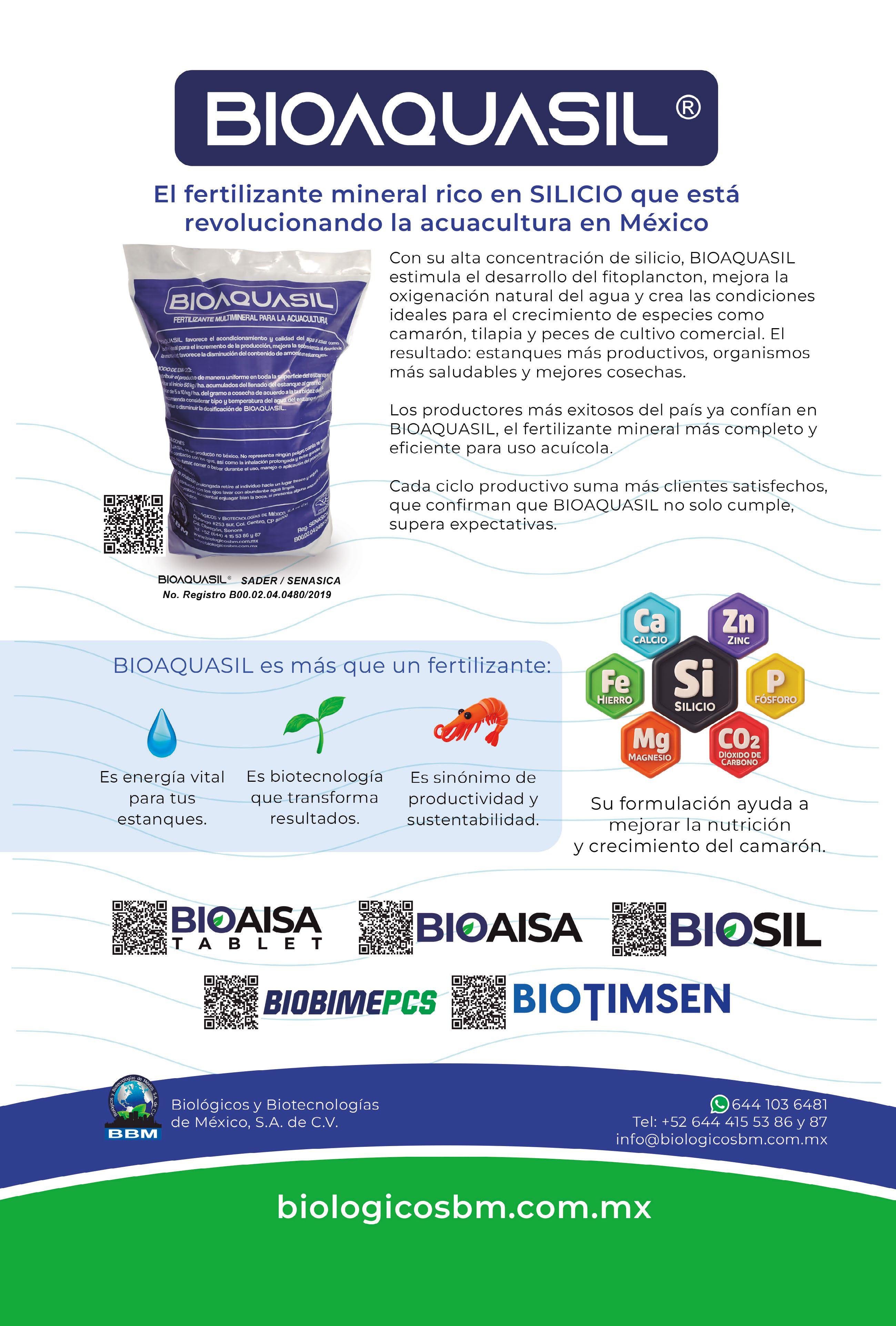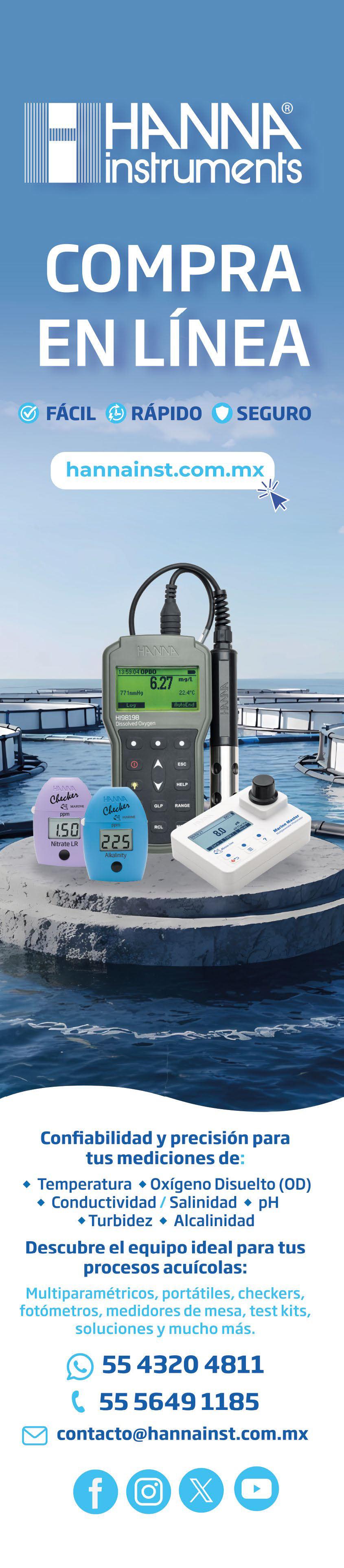 INDUSTRIA ACUICOLA, No. 22.1 - Noviembre 2025, es una publicación bimestral editada por Aqua Negocios, S.A. de C.V. Av. De Las Torres No. 202, Col. José Gordillo Pinto, Mazatlán, Sinaloa, C.P. 82136. Teléfono (669) 257 6671 www.industriaacuicola.com Responsable: Daniel Reyes Lucero daniel.reyes@ industriaacuicola.com Número de Certificado de Reserva otorgado por el Instituto Nacional del Derecho de Autor: 04-2012-051010450800-102. Número de Certificado de Licitud de Contenido: 11574 y número de Certificado de Licitud de Título: 14001, emitidos por la Comisión Calificada de publicaciones y Revistas Ilustradas de la Secretaría de Gobernación. Registro Postal PP25-0003. Permiso SEPOMEX No. PP25-0003, Impresión Celsa Impresos, Cuencamé 108, 4a Etapa Parque Industrial Lagunero Gómez Palacio, Dgo. 35070 México. www.celsaimpresos.com.mx Lapublicidadypromocionesdelasmarcasaquíanunciadassonresponsabilidaddelaspropiasempresas.Lainformación,opiniónyanálisisdelosartículoscontenidos en esta publicación son responsabilidad de los autores y no refleja, necesariamente, el criterio de esta editorial. Queda estrictamente prohibida la reproducción total o parcial de los contenidos e imágenes de la publicación sin previa autorización.