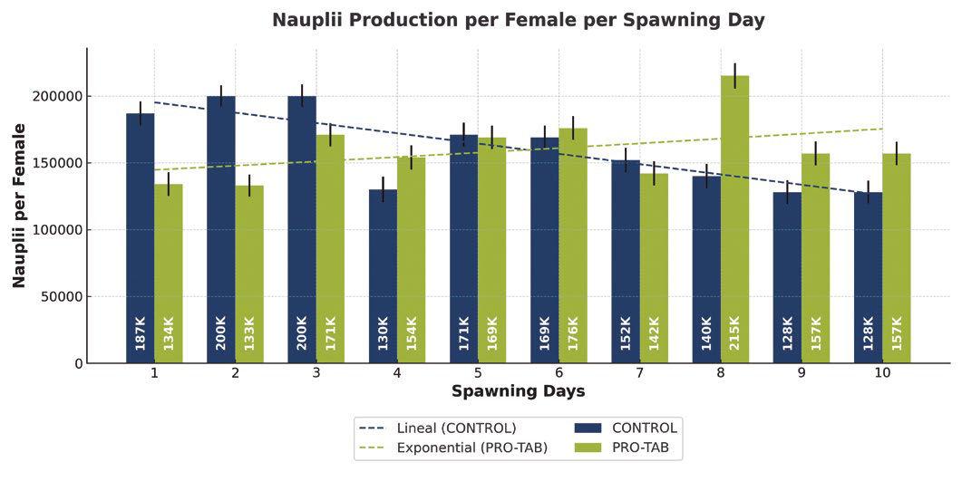 En general, la estrategia correctiva mejoró la biomasa del estanque en un 10 % en comparación con cultivos anteriores, mientras que la estrategia combinada preventiva y correctiva logró una mejora del 64 %. Sorprendentemente, el uso de una dosis preventiva dio como resultado una mejora adicional y significativa de la biomasa en un 50 % en comparación con la suplementación correctiva (Tabla 1).