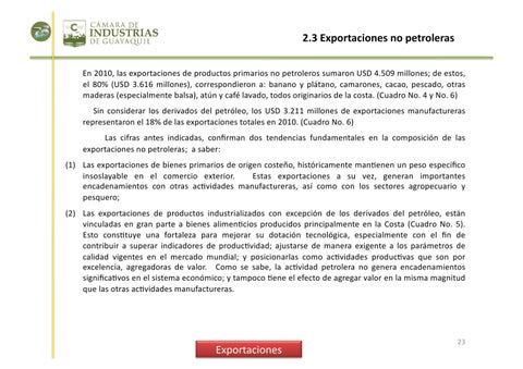 2.3 Exportaciones no petroleras En 2010, las exportaciones de productos primarios no petroleros sumaron USD 4.509 millones; de estos, el 80% (USD 3.616 millones), correspondieron a: banano y plátano, camarones, cacao, pescado, otras maderas (especialmente balsa), atún y café lavado, todos originarios de la costa. (Cuadro No. 4 y No. 6) Sin considerar los derivados del petróleo, los USD 3.211 millones de exportaciones manufactureras representaron el 18% de las exportaciones totales en 2010. (Cuadro No. 6) Las cifras antes indicadas, confirman dos tendencias fundamentales en la composición de las exportaciones no petroleras; a saber: (1) Las exportaciones de bienes primarios de origen costeño, históricamente manCenen un peso específico insoslayable en el comercio exterior. Estas exportaciones a su vez, generan importantes encadenamientos con otras acCvidades manufactureras, así como con los sectores agropecuario y pesquero; (2) Las exportaciones de productos industrializados con excepción de los derivados del petróleo, están vinculadas en gran parte a bienes alimenCcios producidos principalmente en la Costa (Cuadro No. 5). Esto consCtuye una fortaleza para mejorar su dotación tecnológica, especialmente con el fin de contribuir a superar indicadores de producCvidad; ajustarse de manera exigente a los parámetros de calidad vigentes en el mercado mundial; y posicionarlas como acCvidades producCvas que son por excelencia, agregadoras de valor. Como se sabe, la acCvidad petrolera no genera encadenamientos significaCvos en el sistema económico; y tampoco Cene el efecto de agregar valor en la misma magnitud que las otras acCvidades manufactureras.