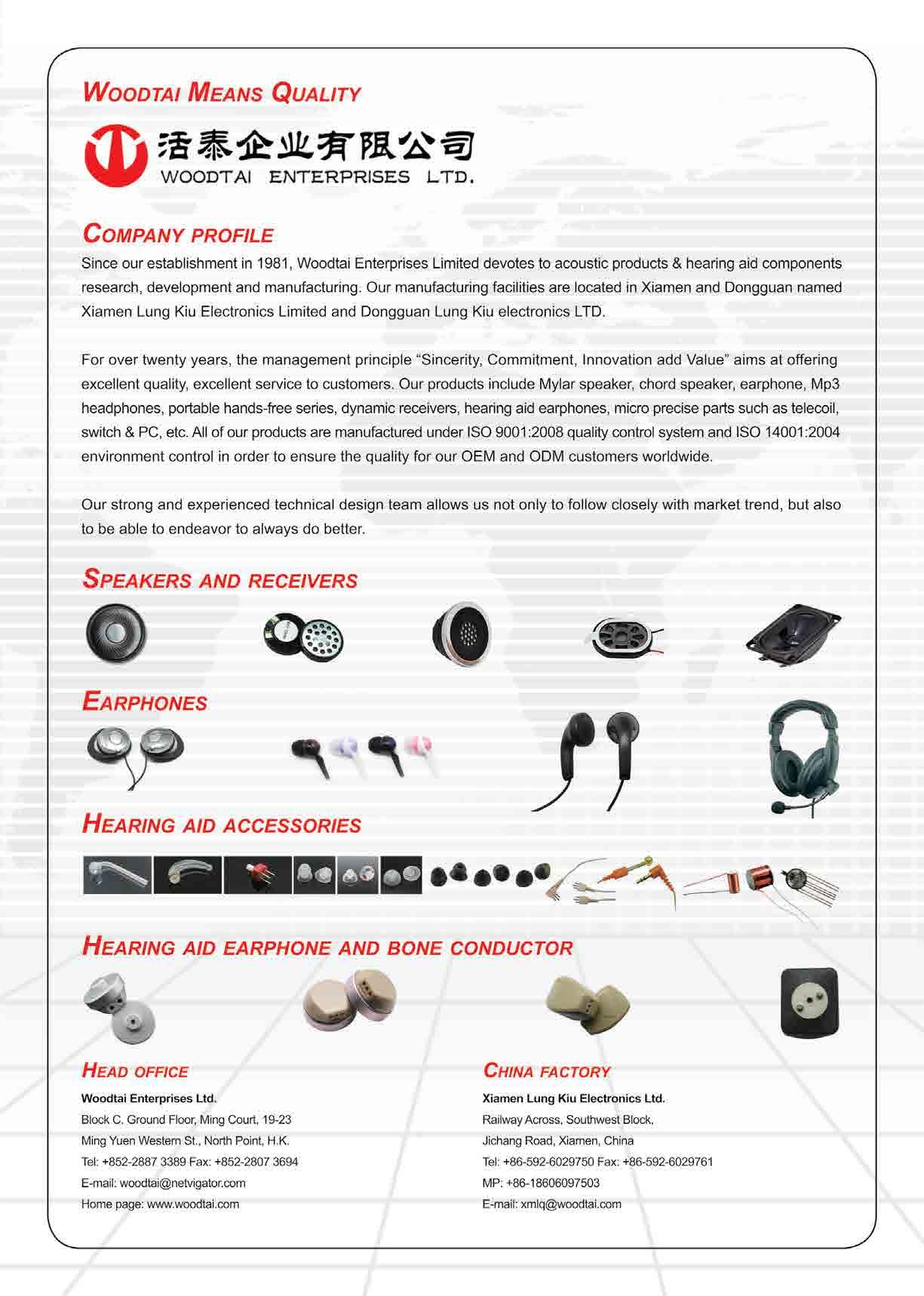 Woodtai develops and produces mini speaker devices, earphones and headphones, acoustic components for hearing aids – including earphones, conductors, sound tubes and filters – and other components for hearing aids, such as telecoil and cables.