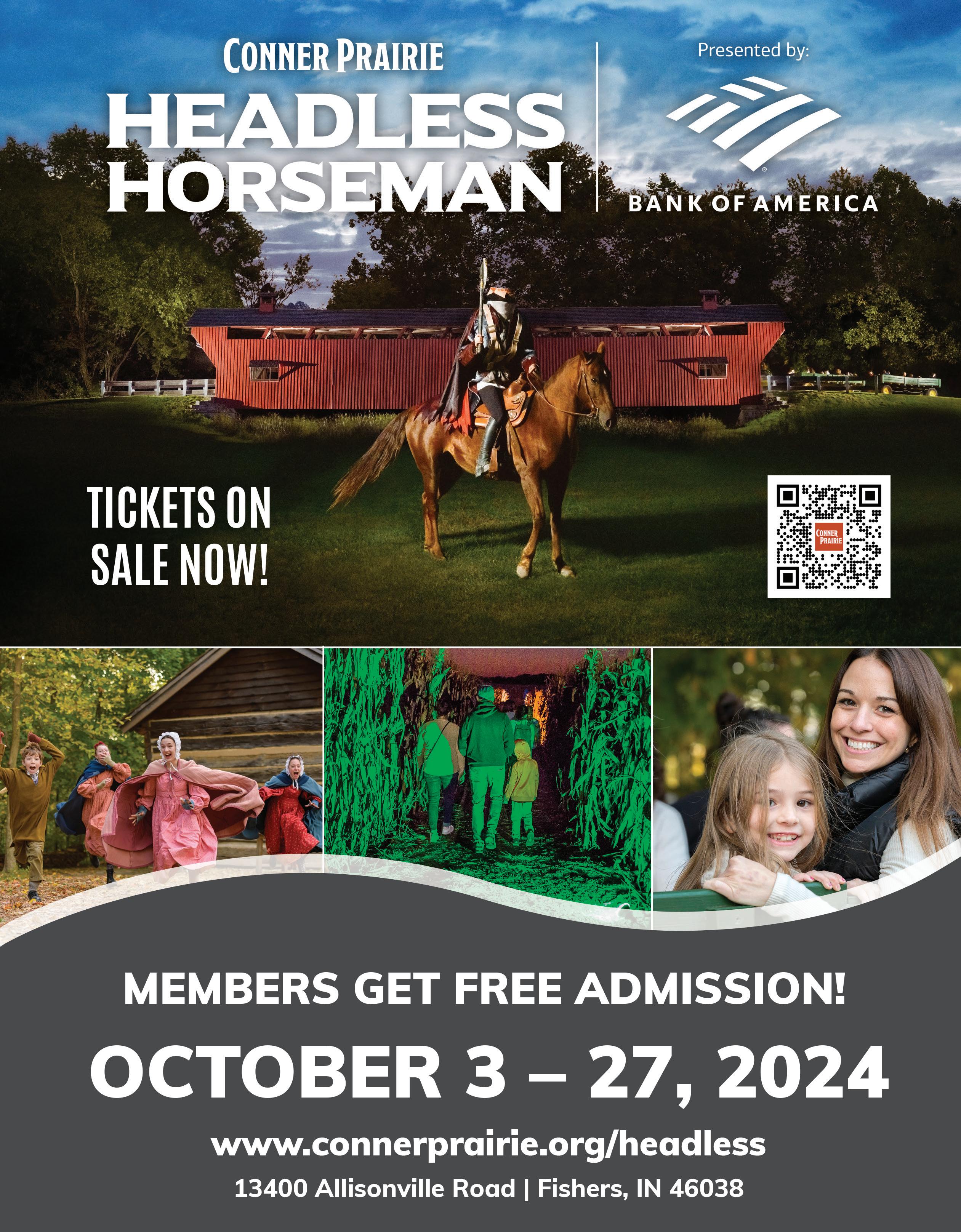 Headless Horseman Festival Oct. 3-27. Conner Prairie’s annual fall festival is full of activities, shows and spooktacular family fun. Take an adventure on our haunted hayride where you’ll get chased down by the Headless Horseman! Location: Conner Prairie, connerprairie.org