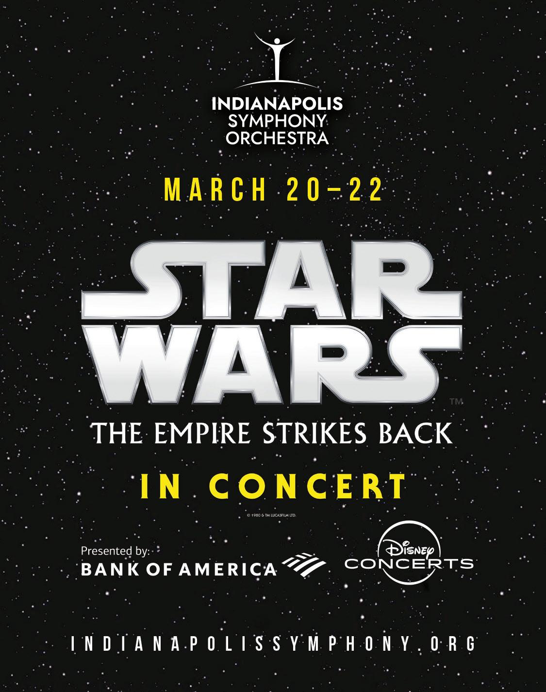 Star Wars: The Empire Strikes Back in Concert Enter the Star Wars universe with the Indianapolis Symphony Orchestra for Star Wars: The Empire Strikes Back in Concert, featuring the ISO performing John Williams’s Grammy-winning score live to the film. Arrive early to have your photo taken with Star Wars characters in the lobby! Location: Hilbert Circle Theatre, indianapolissymphony.org