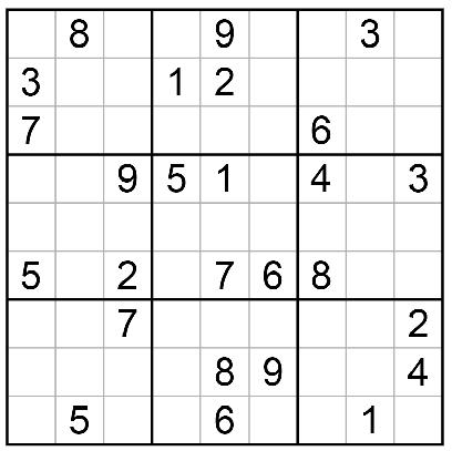 There is really only one rule to Sudoku: Fill in the game board so that the numbers 1 through 9 occur exactly once in each row, column, and 3x3 box. The numbers can appear in any order and diagonals are not considered. Your initial game board will consist of several numbers that are already placed. Those numbers cannot be changed. Your goal is to fill in the empty squares following the simple rule above.