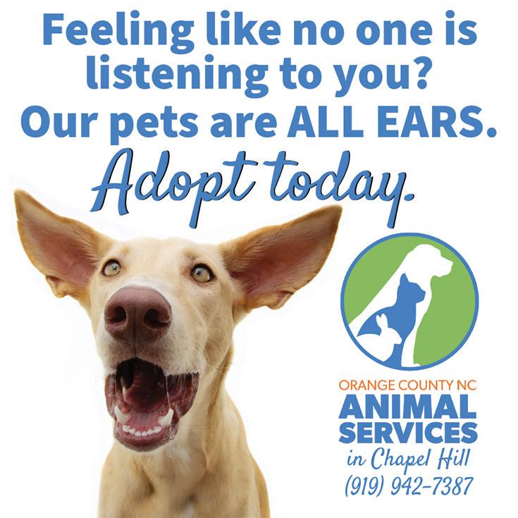 All pets featured on the cover are available for adoption from Independent Animal Rescue at 3321 Guess Rd, Durham, (919) 403-2221, and animalrescue.net