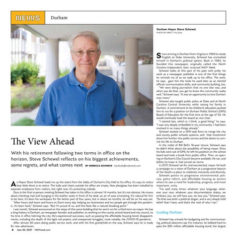 s Mayor Steve Schewel leads me up the stairs from the lobby of Durham’s City Hall to his office, it’s easy to notice how little there is to notice. The halls and chairs outside his office are empty. New plexiglass has been installed to separate employees from visitors, but right now, it’s protecting nobody. Ours is the first in-person meeting Schewel has taken in his office in almost 14 months, but it’s not obvious. He moves about checking mail and lounging in the leather seats in front of his desk, an air of ease emanating. It’s natural for him to be here; it’s been his workspace for the better part of four years, but in about six months, he will be on his way out. “After hours and hours and hours on Zoom every day, helping our businesses and our people get through the pandemic, it’s been hard,” Schewel says. “But I’m proud of us, and this feels like a natural breaking point.” Last month, Schewel announced on the steps of this same building that he won’t run for a third term as mayor. He has a long history in Durham, as newspaper founder and publisher, to working on the county school board and city council, to his time in office helming the city. He’s experienced successes, such as passing the affordable housing bond; disappointments, including the death of the light rail project; and unexpected struggles, most notably, the COVID-19 pandemic. After almost 40 years doing public service work, and with his first grandchild on the way, Schewel says he is ready for new adventures. 6