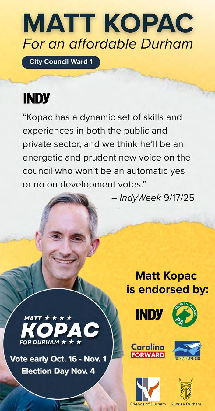 Check out all of the INDYʼs 2025 election coverage, find candidate questionnaires, and read our full endorsements at indyweek.com/elections indyweek.com/elections