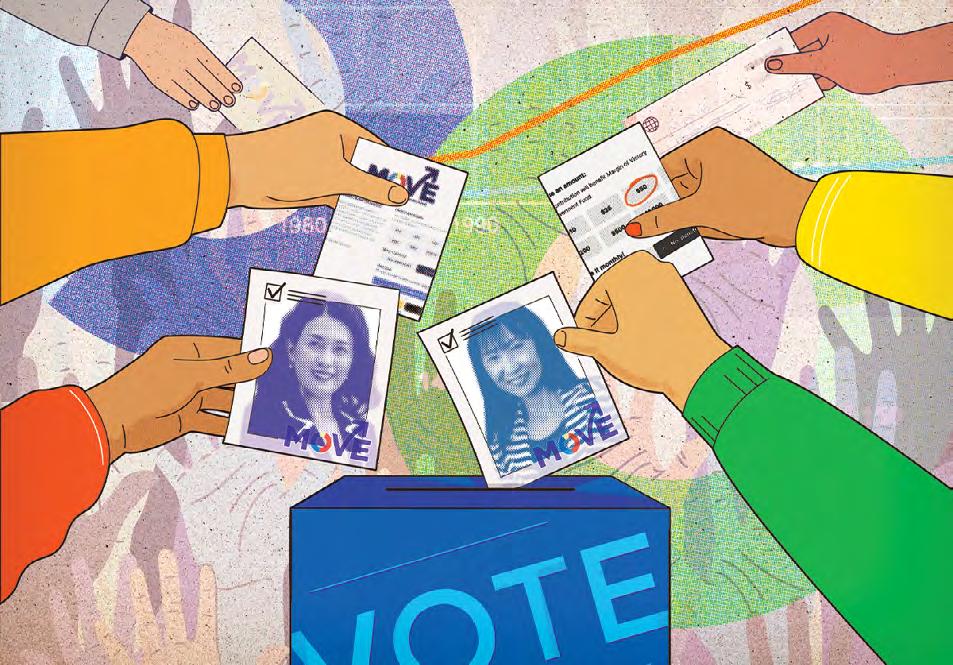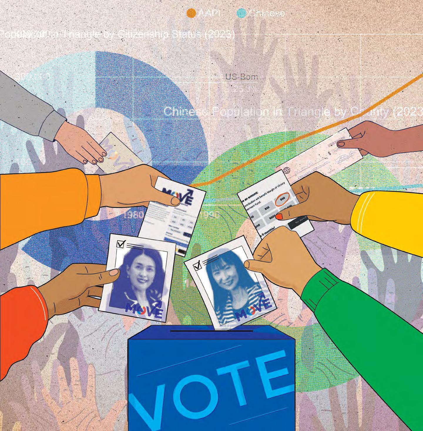 Candidates Bella Huang and Sue Mu have the support of MOVE PAC and many in a small but growing Chinese American community in Wake County. ILLUSTRATION BY NICOLE PAJOR MOORE