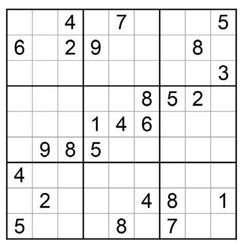 There is really only one rule to Sudoku: Fill in the game board so that the numbers 1 through 9 occur exactly once in each row, column, and 3x3 box. The numbers can appear in any order and diagonals are not considered. Your initial game board will consist of several numbers that are already placed. Those numbers cannot be changed. Your goal is to fill in the empty squares following the simple rule above.