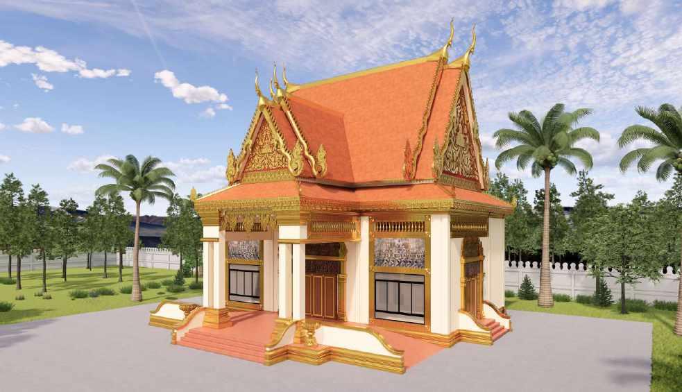 សំណង់់សាសនា (កំុដិ) នេះ តេូវបានសិកំេសាយ៉េង់ហ្មត្ត់ចត្ត់នូវការ បេើបេេស់កំេបាច់លម្អរខ្មេរដេលបំពាកំ់ទៅលើគេឿង់បង់្គុំសំខាន់ៗនេ អគារ។ ជាមួយការដកំយកំមកំបេើនូវដង់កា្ដេរដេលមានខ្លួនពត្ត់ ពេនភ្ជេប់នឹង់កំេបាលនាគកំេបាច់អង់្គរ រំលេចនូវកំេបាច់ផ្កេច័ន្ទនៅលើ ដង់ខ្លួន កាន់តេធ្វើឲសំណង់់នេះមានលកំ្ខណៈពេញលេញ និង់ បេណិត្ត នៅពេលបំពាកំ់លើដំបូលកំឹង់មុខកាត្ត់នេះ។