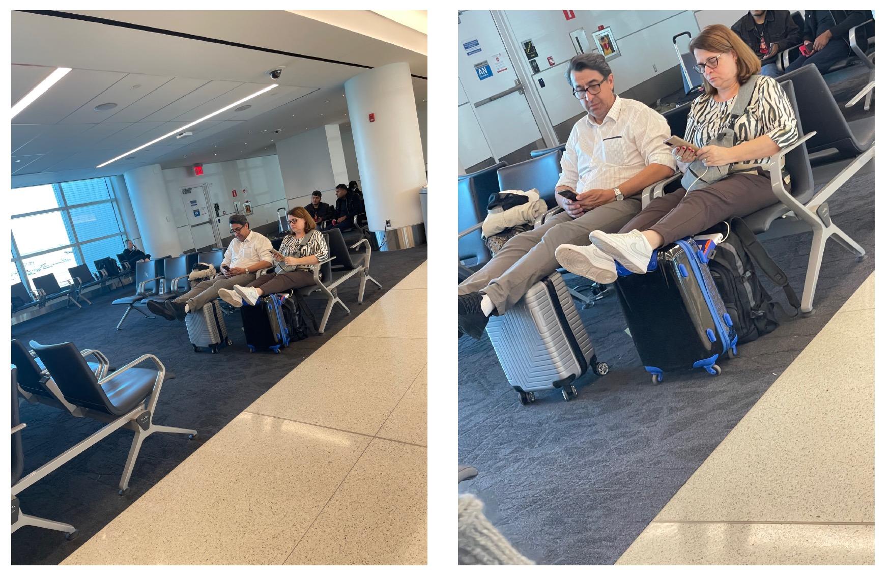 Passengers find themselves adjusting their posture and relying on their personal belongings in an attempt to discover some semblance of comfort. The realization that such adjustments won't be feasible once inside the plane prompts these adaptations. Phones remain in hand, signaling a disconnect from social interaction. The expression on a woman's face vividly communicates her discomfort, encapsulating the shared sentiment among passengers as they navigate the challenges of air travel.
