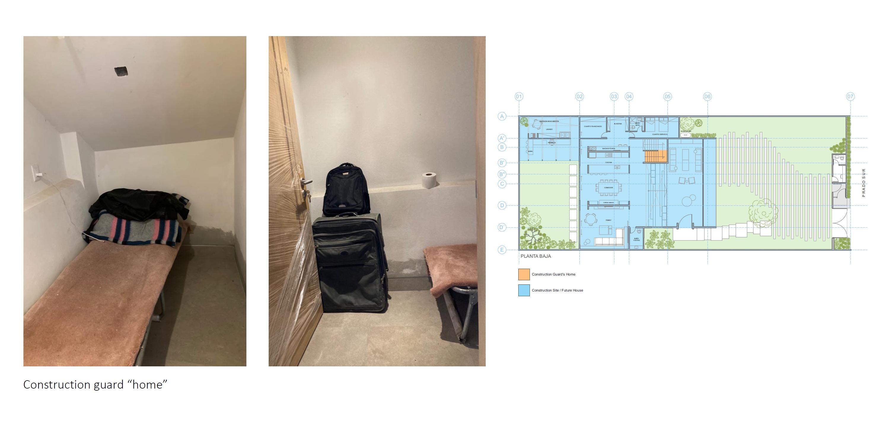 Despite this profound relationship, the needs of the "velador" are often overlooked, resulting in the provision of a rudimentary space aimed solely at minimizing his interaction with the house and other workers. This oversight reflects a broader tendency within the construction industry to prioritize efficiency and functionality over the holistic well-being of all individuals involved. This research emphasizes the importance of considering human factors in design and planning processes, particularly in environments where individuals spend extended periods of time. By recognizing the unique role and experiences of the "velador," we can begin to address the shortcomings in current construction practices and develop more inclusive and human-centered approaches to building design.
