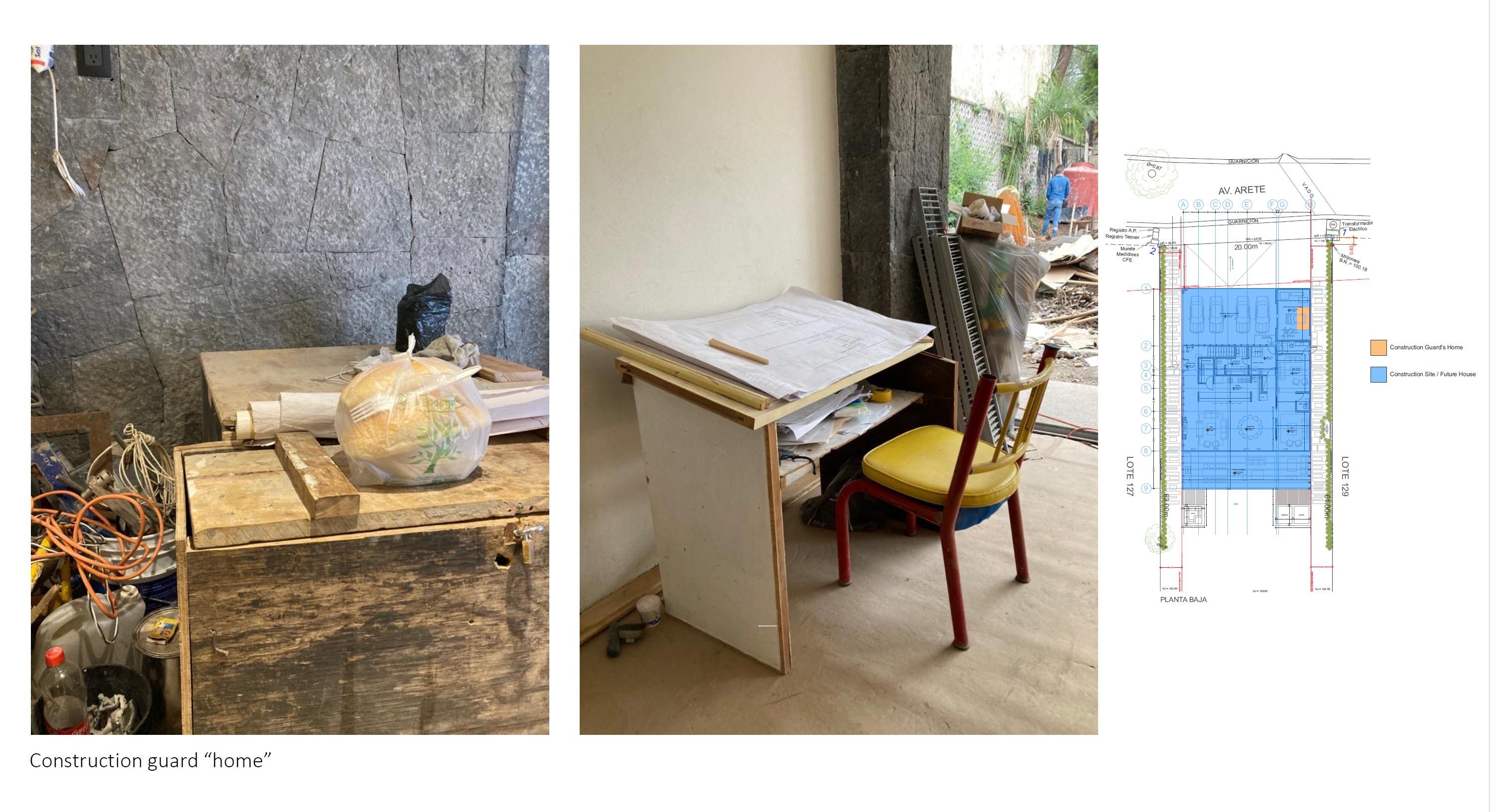 By understanding the universal needs and circumstances that influence all individuals to adapt a space into a home, regardless of space and time constraints, and assuming a holistic, integral, and inclusive design approach, I believe we can help all and every inhabitant of a house achieve, albeit temporarily, a sense of home. Among the early inhabitants of a house, probably no one develops a more intimate relationship with the construction than the “velador”. Furthermore, because in the construction hierarchy, the “velador” is the starting step and also because he spends most of the time alone, his needs rarely rise awareness. Facilitating and humanizing the journey within the journey of constructing home for the “velador” is the starting point of re-thinking ”home”.