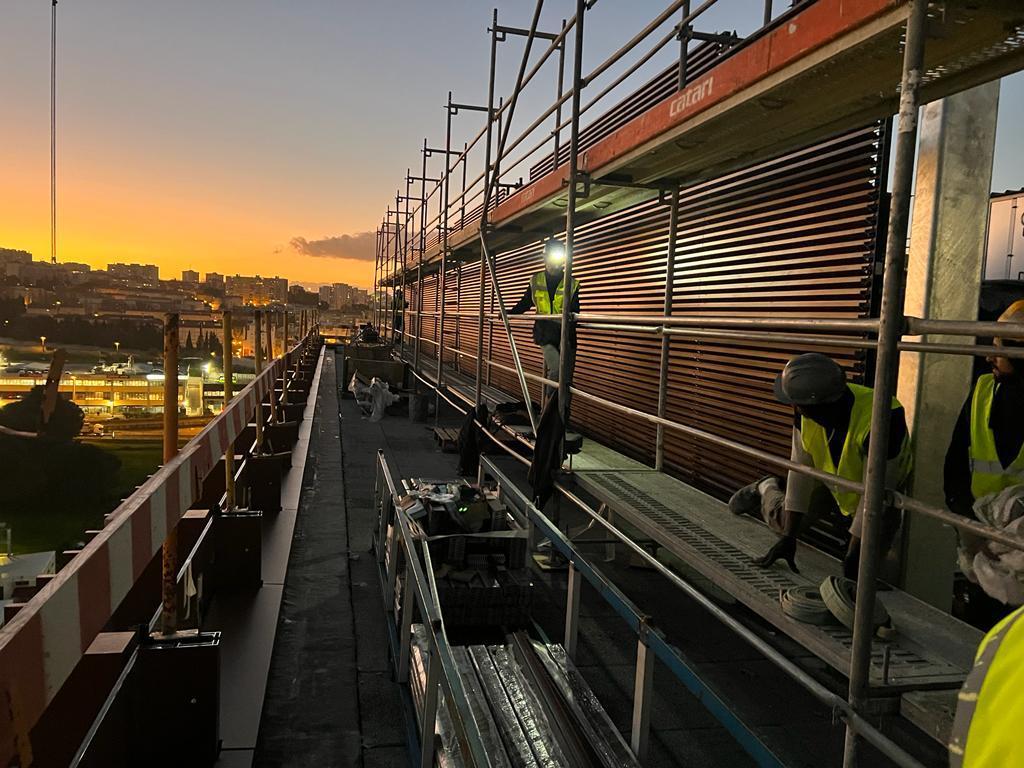Atualmente estamos a intervir no Stand - 3ª fase da obra, a executar os pavimentos exteriores do parque norte, a concluir os revestimentos exteriores da cobertura e fachadas, no interior estamos a concluir as instalações especiais (AVAC, Instalações Elétricas, Águas e Esgotos) e a executar os acabamentos ao nível dos revestimentos interiores de tetos e paredes.