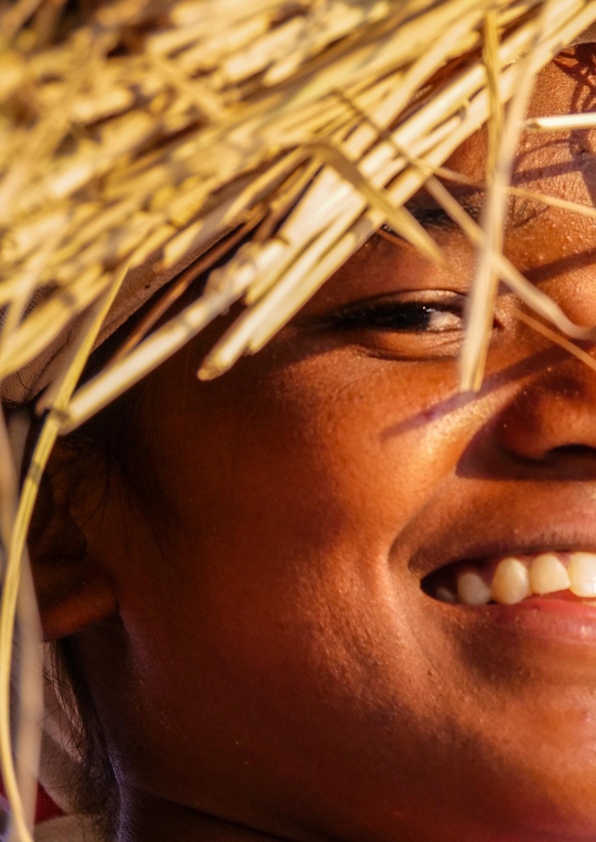 It is a new day and we travel to a village community. Journeying through the fields we give respect to the day labourers harvesting rice. Around the hills we travel to a village by the river. We walk in.