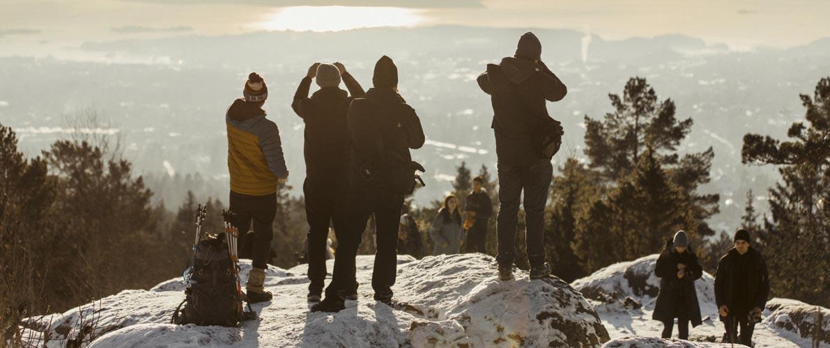 our destination–the summit of Vettakollen mountain, from where you’ll look down over Oslo and the vast Oslofjord, an awe-inspiring sight that will take your breath away. Our hike will wind through the serene winter forest and past small frozen ponds that are inhabited by the mystical creature named Huldra. Our first stop is a charming small Norwegian cabin called Fuglemyrhytta – a perfect spot to pause, relax and take in the views. Here, your guide will share the importance of these cabins in Norwegian culture. From here our adventure will continue through the snow laden forest to the most spectacular spot of our journey – the summit of Vettakollen mountain offering