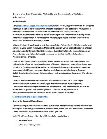 Global In Vitro Organ Preservation Marktgröße und Branchenanalyse, Wachstum, Unternehmen