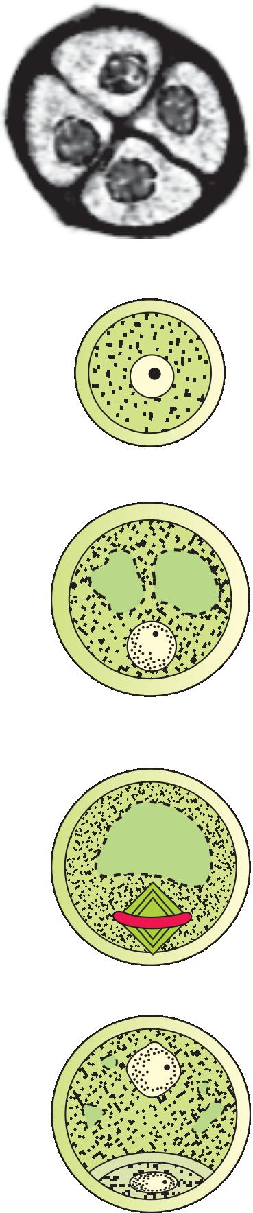 Fig. 1.6 (a) Enlarged view of a pollen grain tetrad; (b) stages of a microspore maturing into a pollen grain