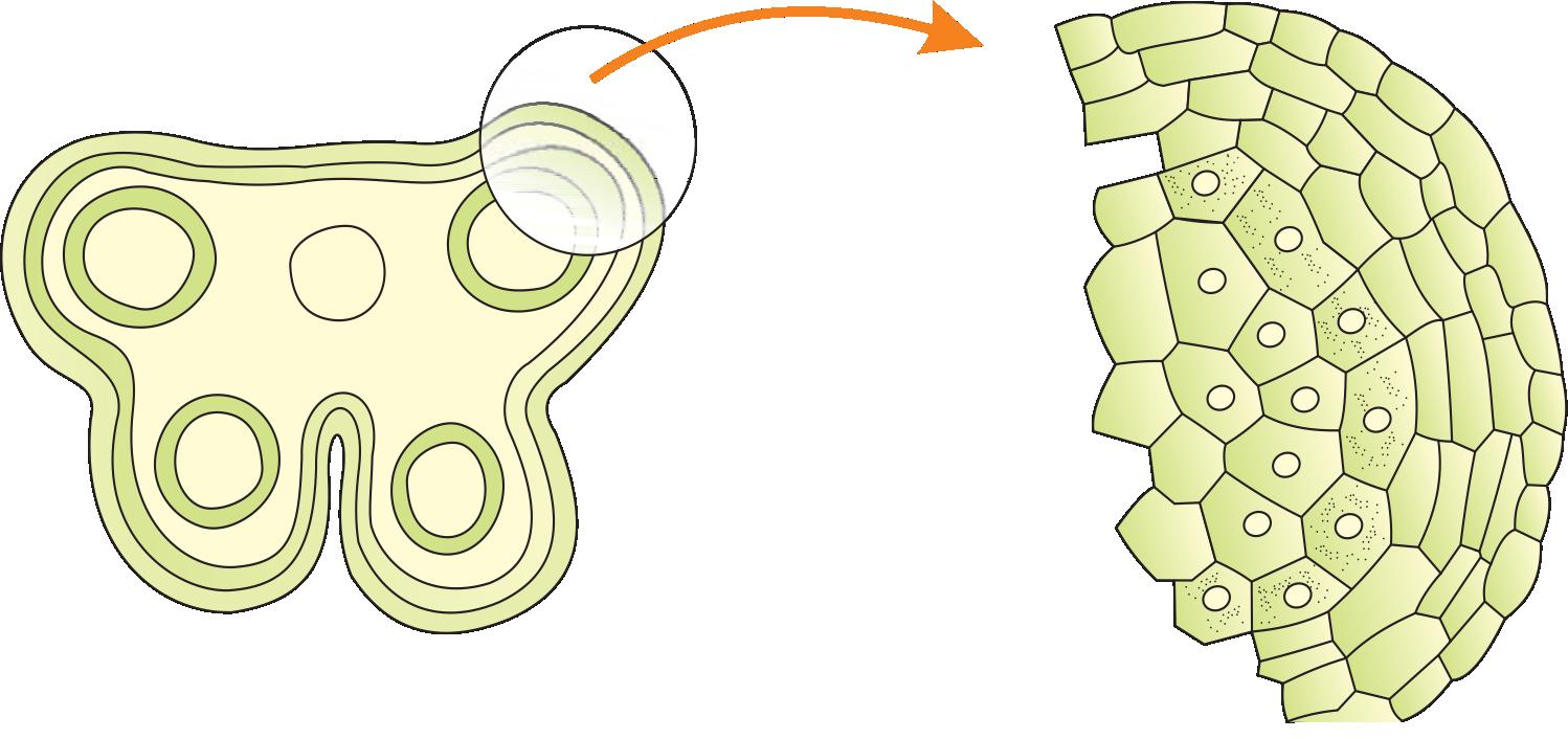 In a transverse section, a typical microsporangium appears near circular in outline. It is generally surrounded by four types of wall layers. The epidermis, endothecium, middle layers, and the tapetum (Fig. 1.4). The outer three wall layers perform the function of protection and help in the dehiscence of anther to release the pollen.