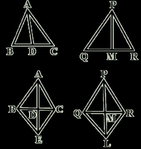 4. If in two triangles, sides of one triangle are proportional to (ie, in the same ratio of) the sides of the other triangle, then their corresponding angles are equal and hence the two triangles are similiar. (SSS criterion)