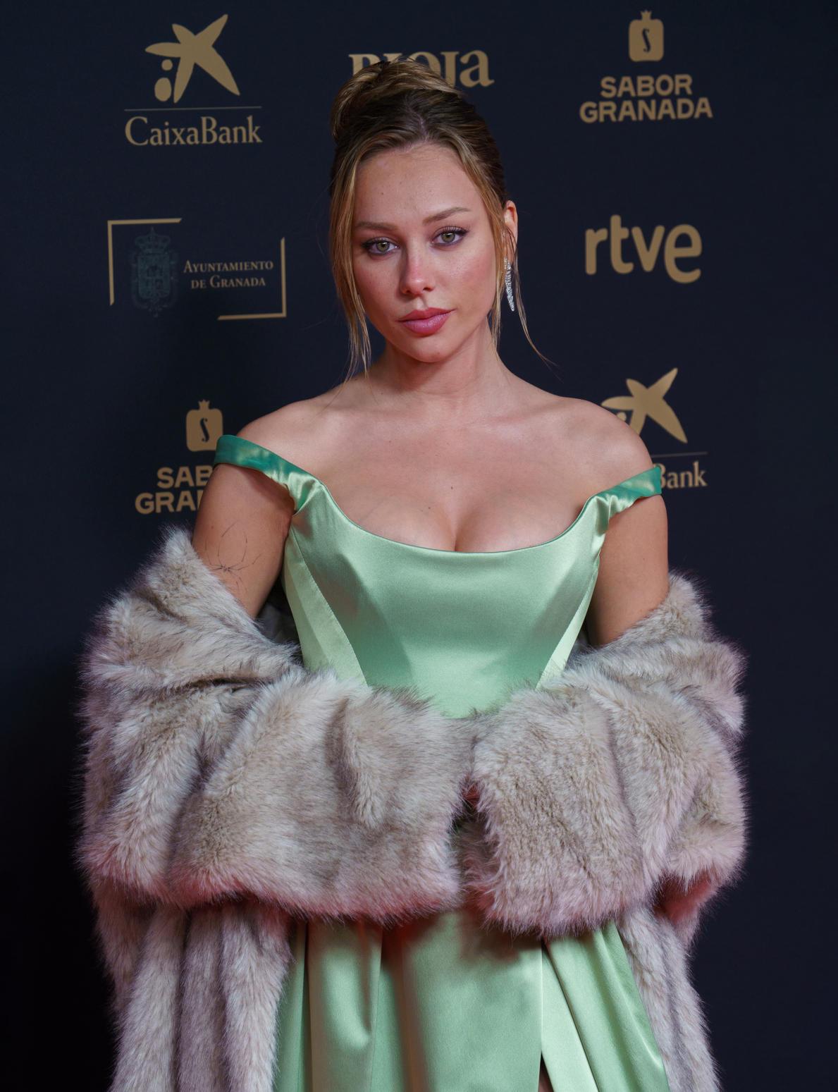 La reciente edición de los Premios Goya 2025 en Granada fue testigo de la sofisticación de Expósito. Lució un vestido verde pastel de Vivienne Westwood, caracterizado por un corsé con tirantes caídos y una falda voluminosa con abertura lateral. Complementó su atuendo con sandalias plateadas y joyas brillantes, evocando a la icónica Campanilla. Su peinado, un moño desenfadado con mechones sueltos, y un maquillaje natural resaltaron su belleza.